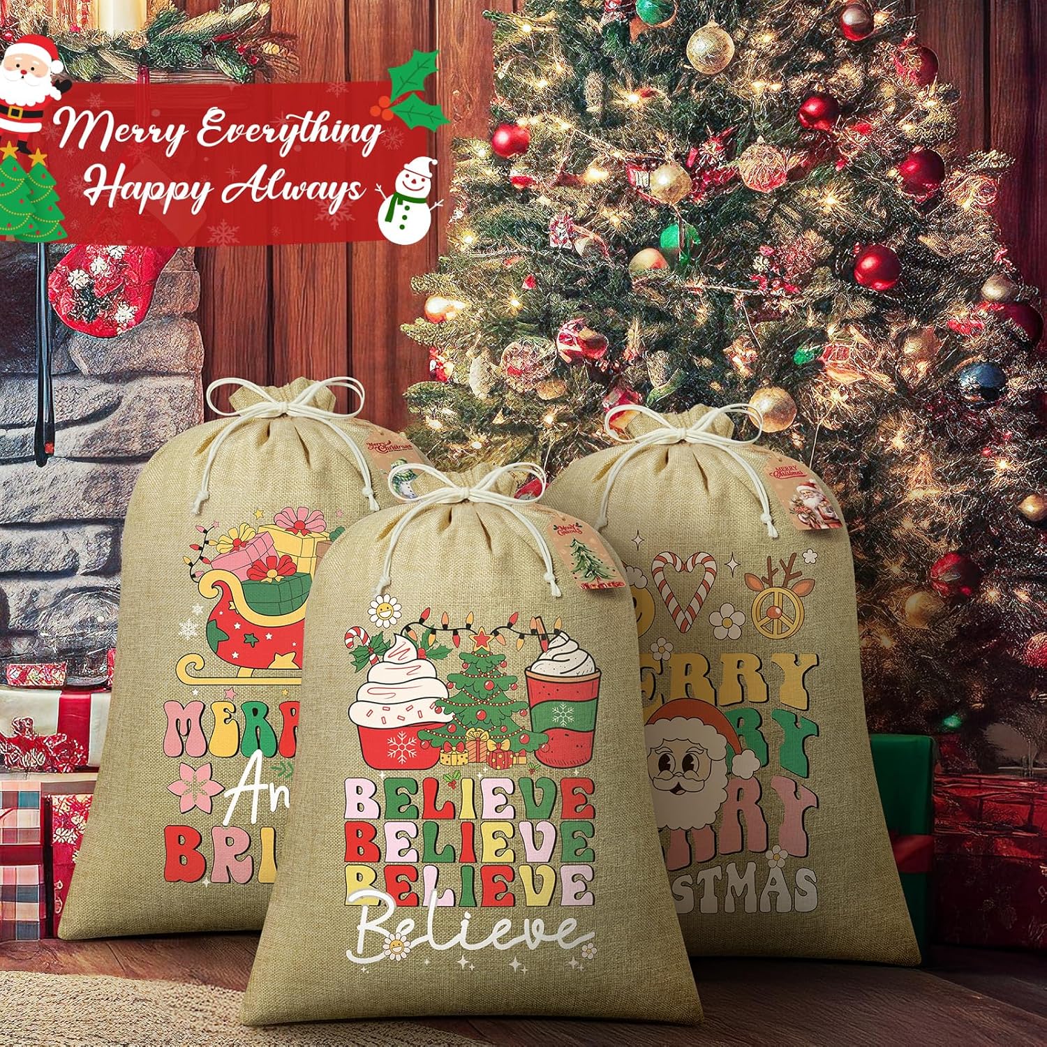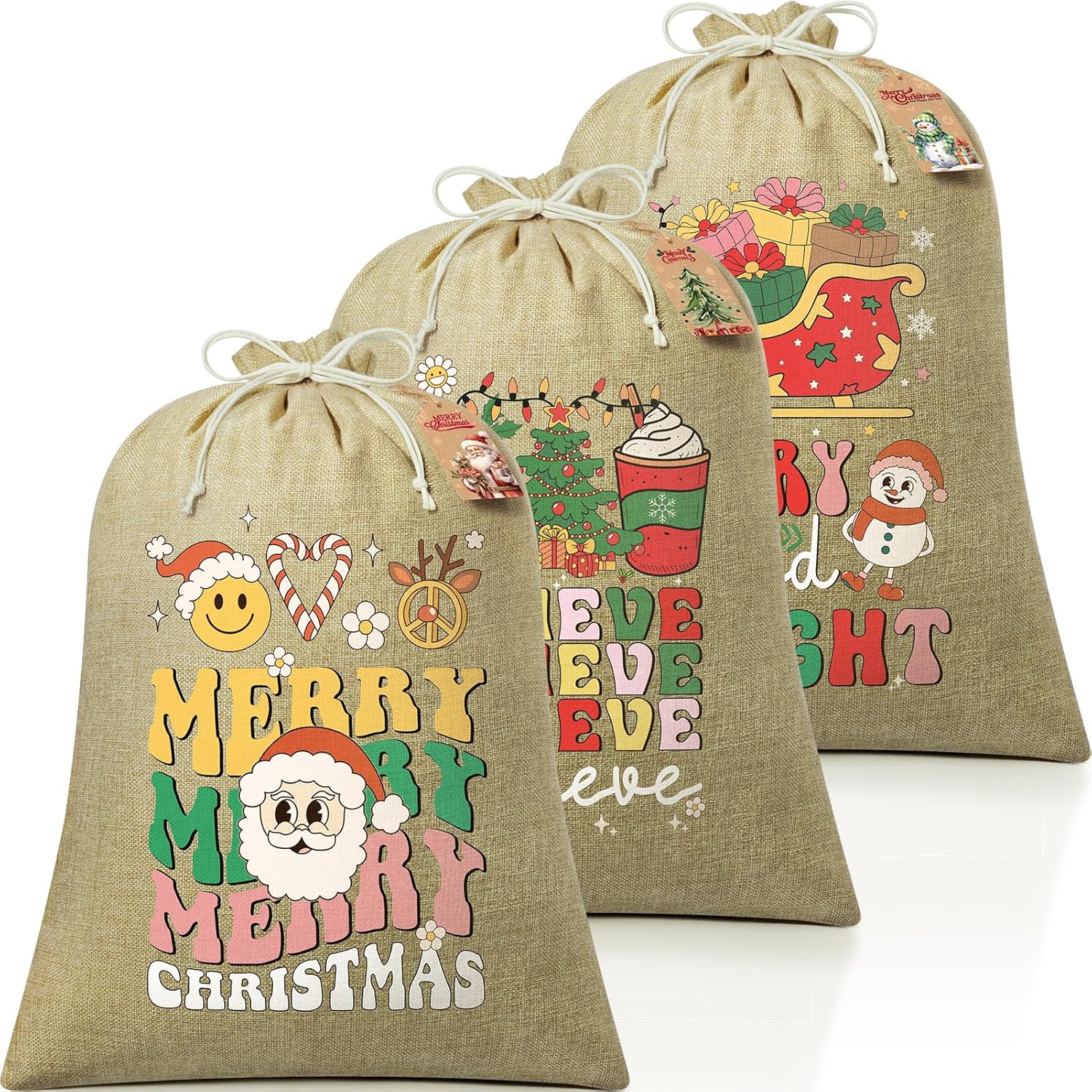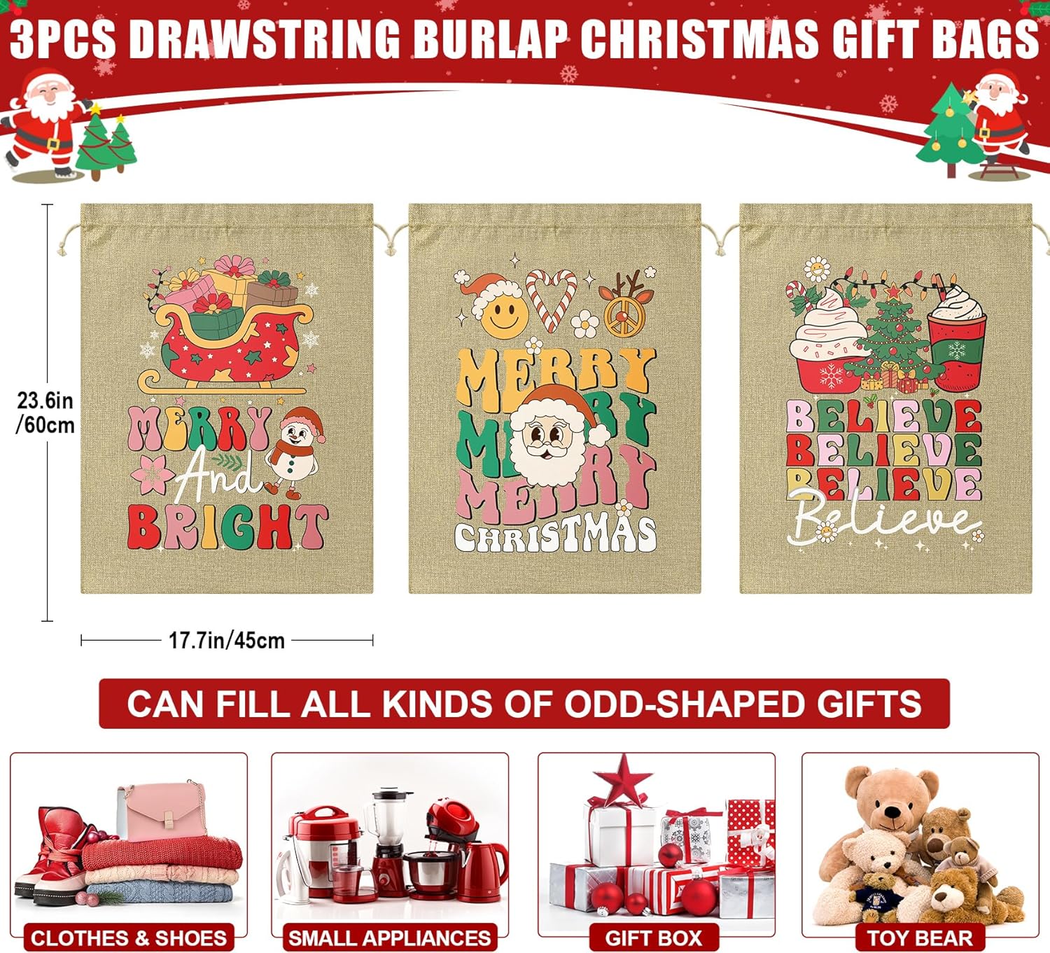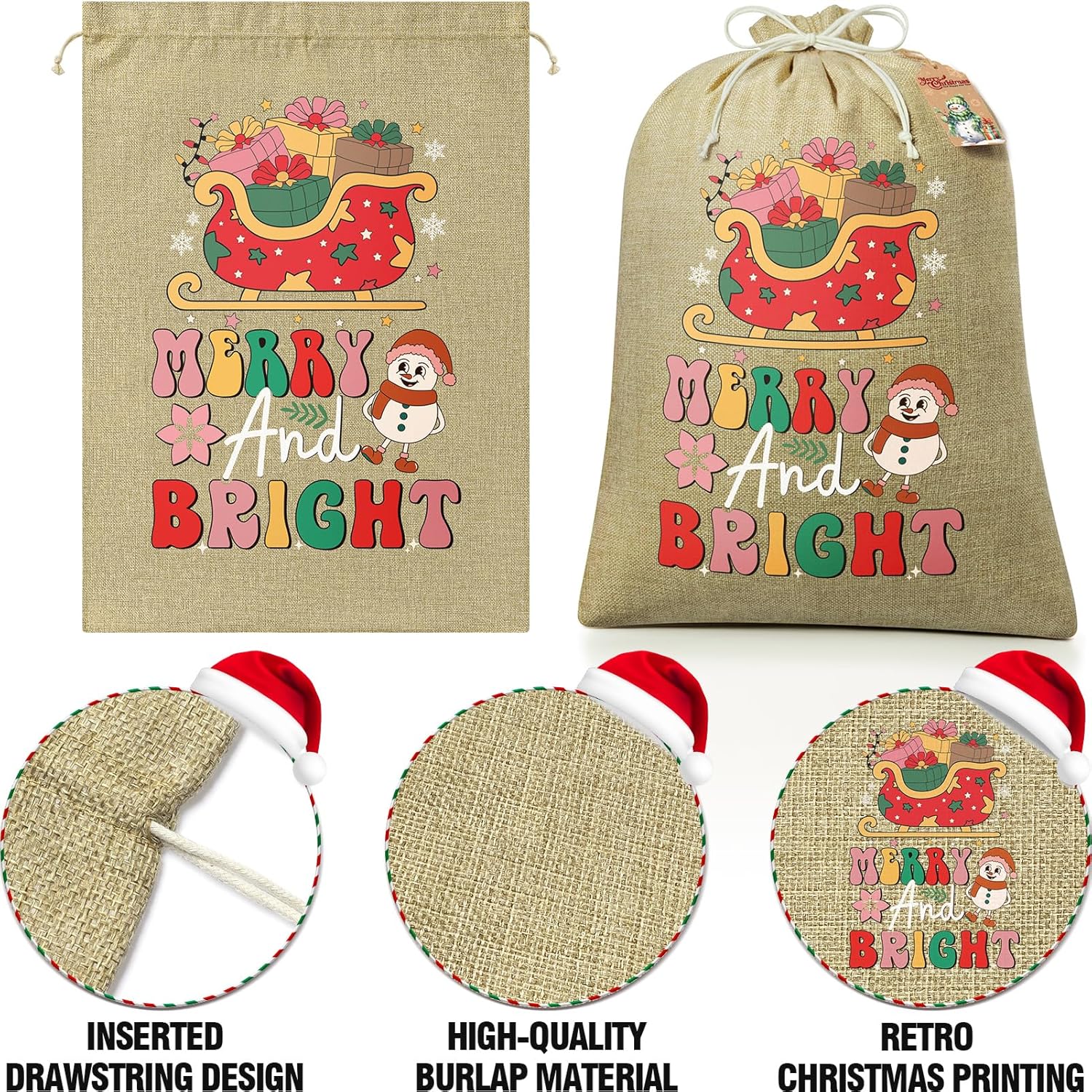 GROOVY DESIGN & DECORATION: Featuring exquisite retro Christmas prints on natural burlap, these stylish and trendy reusable Christmas treat bags perfectly align with the holiday theme, creating a delightful Christmas atmosphere, making them ideal for decorating your home, office, or placing under the Christmas tree. Our Cloth Christmas Drawstring Bags serve as lovely gift bags, hanging ornament, or festival decor, bringing a joyful holiday vibe & leaving you with cherished memories of the season