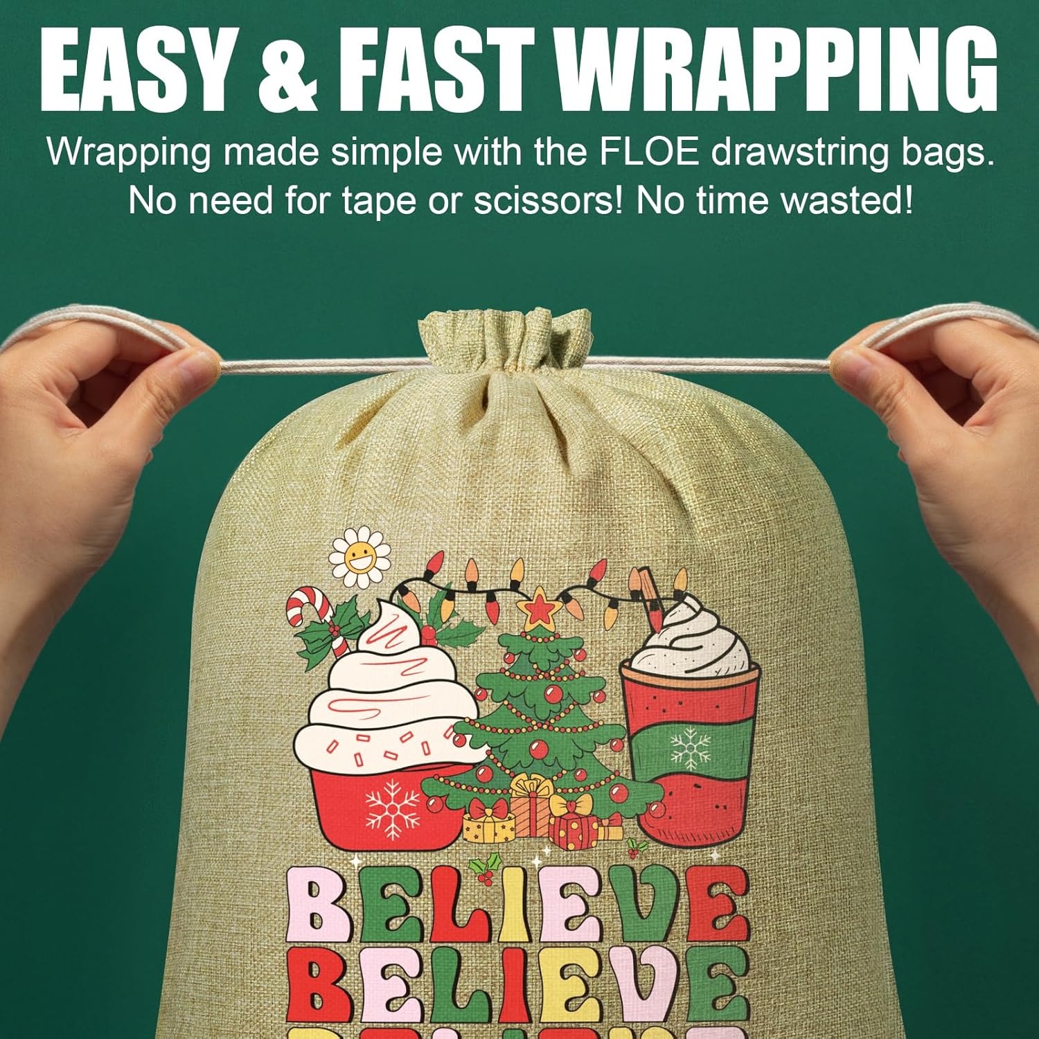 MULTI-FUNCTION GIFT SACKS: FLOE Christmas Drawstring Burlap Bags Linen Xmas Present Bags provides spacious space to hold large Christmas presents or daily groceries, perfect for large toys, thick blankets & clothes, pillows, appliances, wines, books, candies, cookies, party favors or odd-sized gifts. Ideal Gift Wrapping Bags Cotton Fabric Storage Bags or festival decor for various occasions like rustic wedding, showers, birthday, churches, receptions, Christmas parties & other festive occasions
