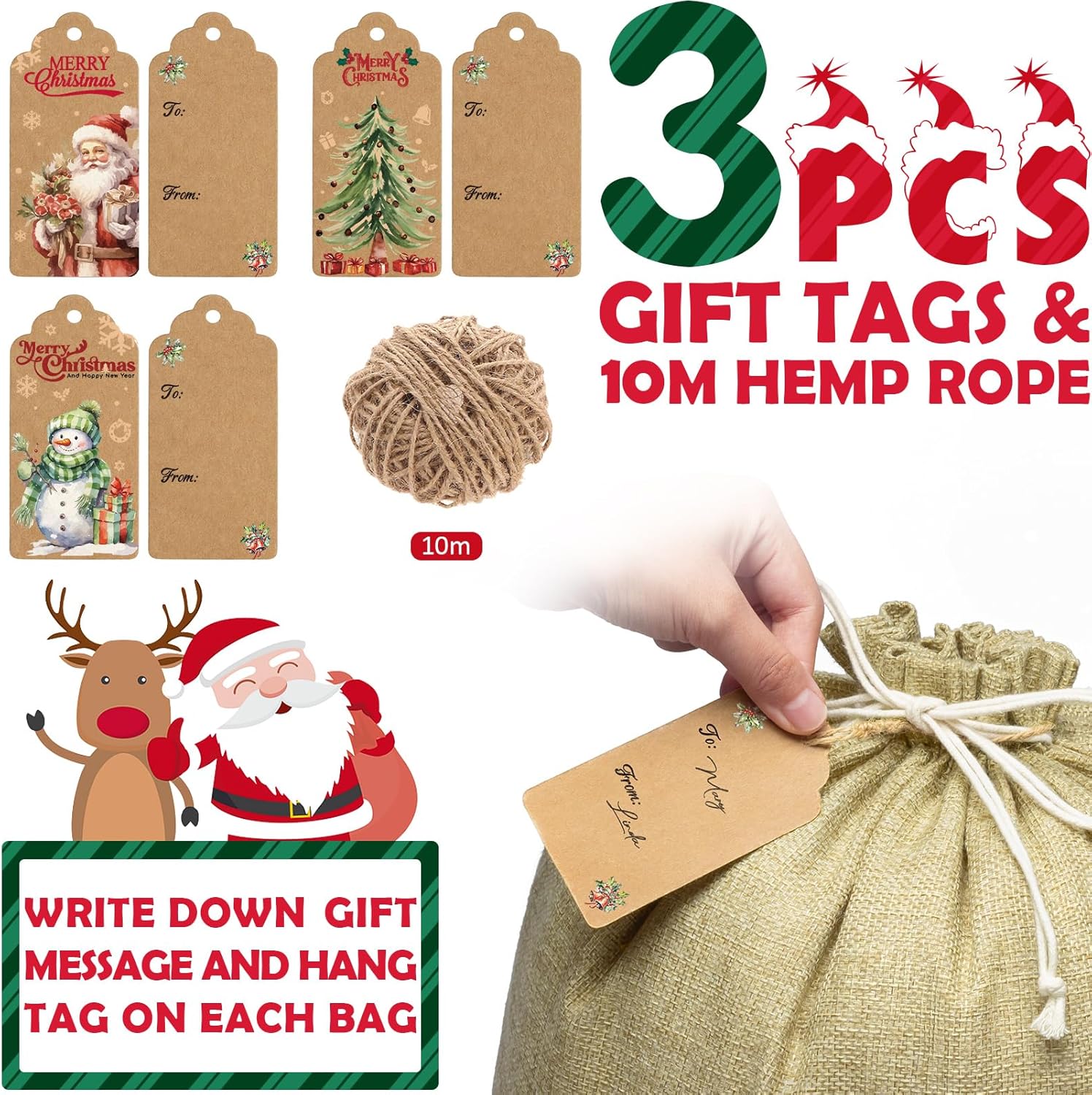LARGE CHRISTMAS GIFT BAGS WITH TAGS: FLOE Large Burlap Christmas Drawstring Gift Bags come in a set of 3 Large Christmas Bags (18 x 24″) to suit all your gifting needs. Equipped with high-quality kraft paper gift tags, each featuring charming and classic Christmas designs that are sure to delight the recipient! You can add your heartfelt messages to the tags and easily attach them using the included 10-meter-long jute ropes to our Burlap Christmas Gift Wrapping Bags for your holiday presents