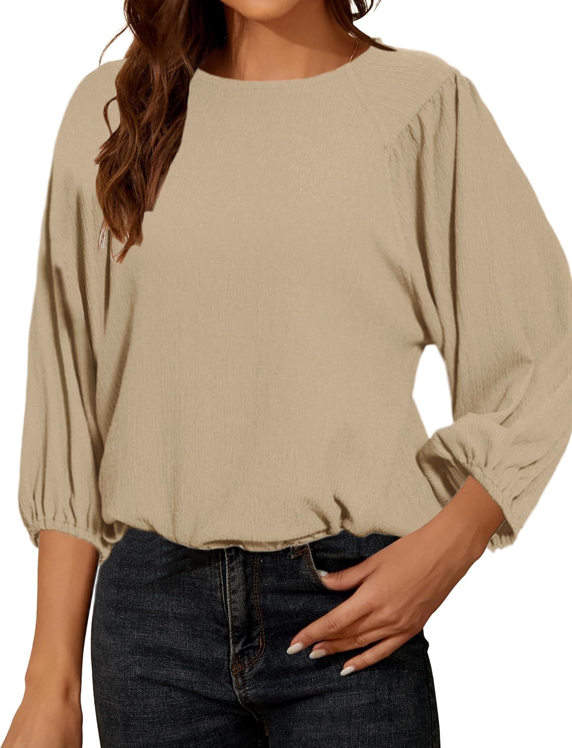 Crafted from a soft, textured fabric, With a flattering 3/4 sleeve puff design and a relaxed fit, they offer a versatile, A must-have addition to your fall and winter wardrobe.