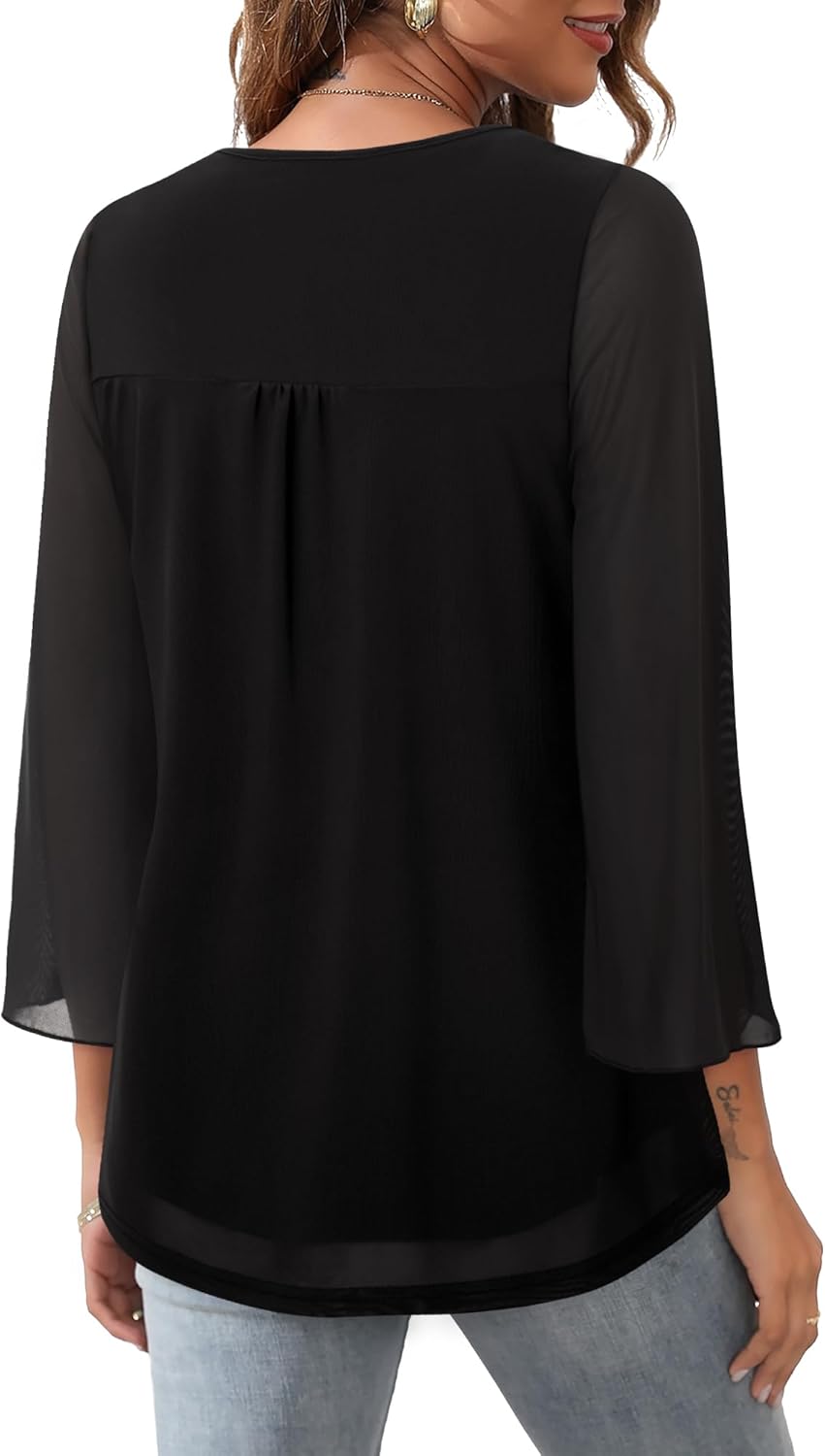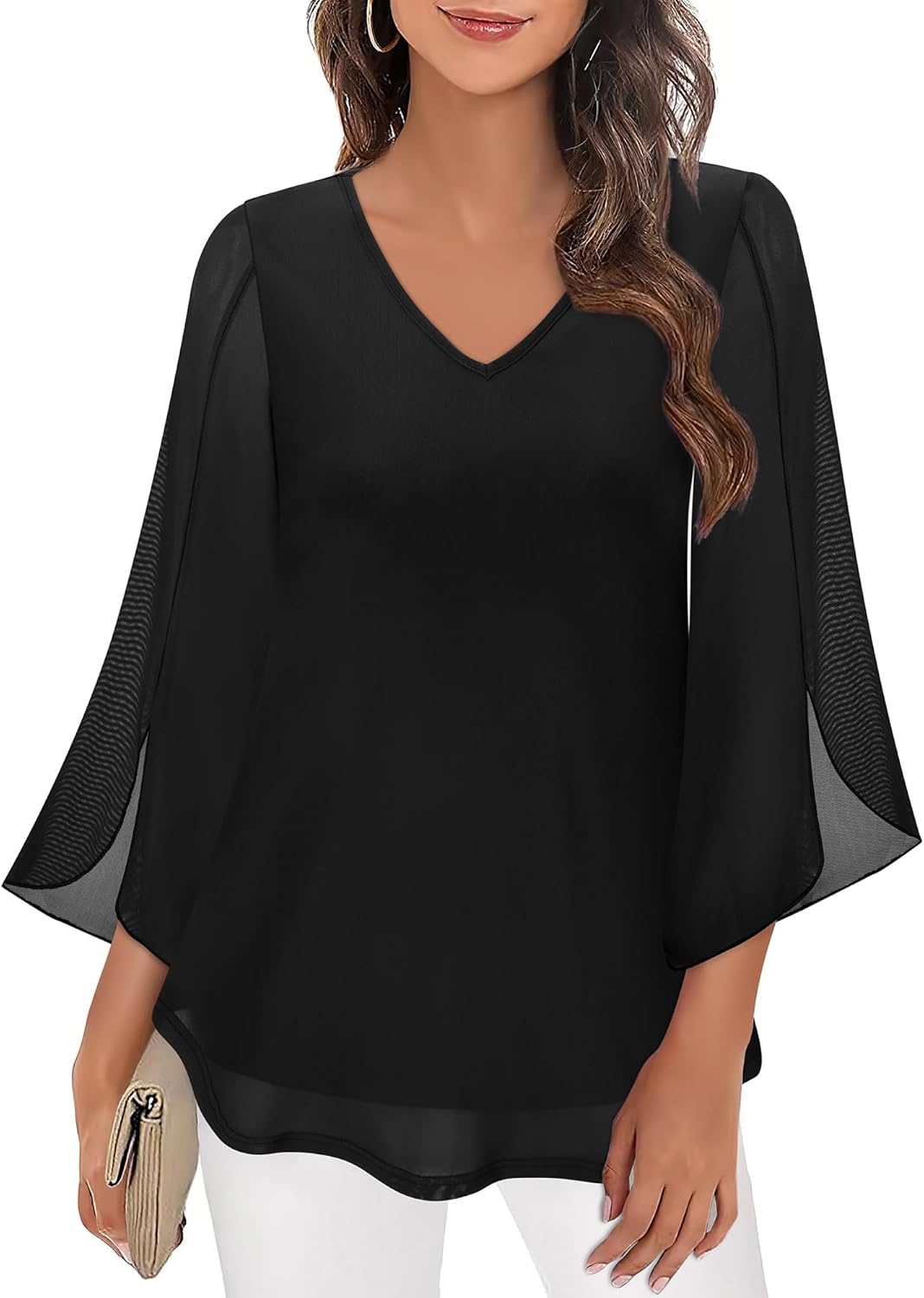 Bebonnie Womens Ruffle 3/4 Sleeve V Neck Double Layers Mesh Blouses Loose Fit Flowy Tunic Tops