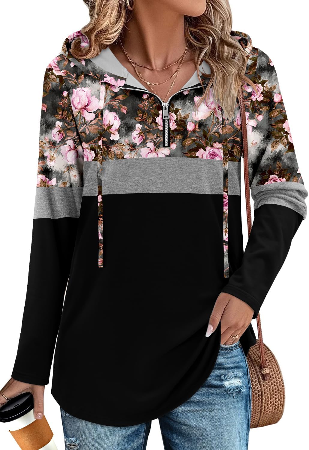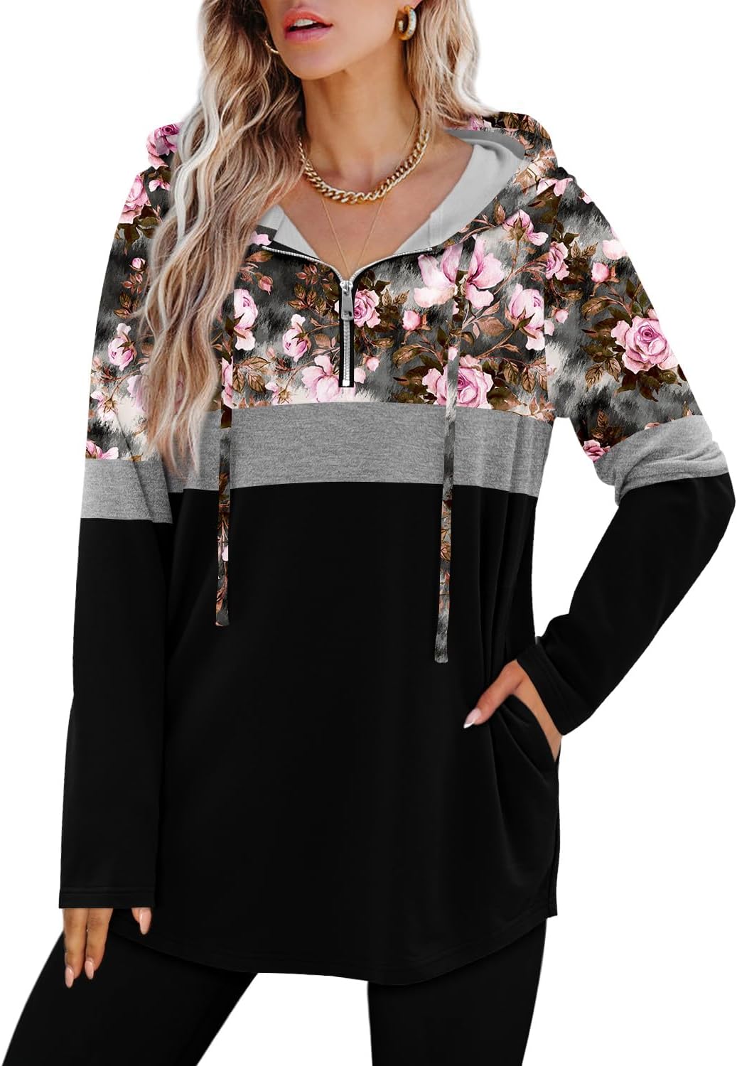 Features: Womens quarter zip pullover hoodies long tunic hooded sweatshirt,long sleeve,side hidden pockets,zipper and pull string, comfortable, fashionable,completes a more fashionable look.the basic solid color matches everything,floral pattern for choice.