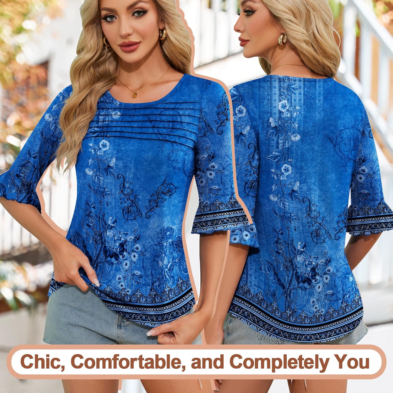 Women 3/4 Sleeve Shirts Casual Tops Dressy Floral Blouses Fashion Tunic Blouse
