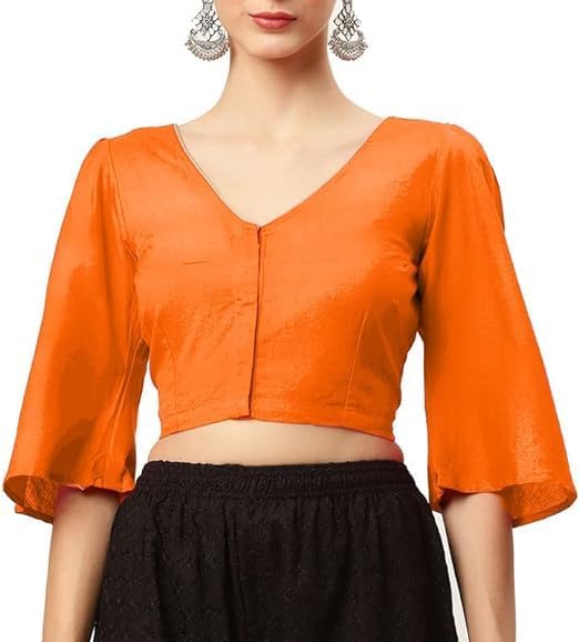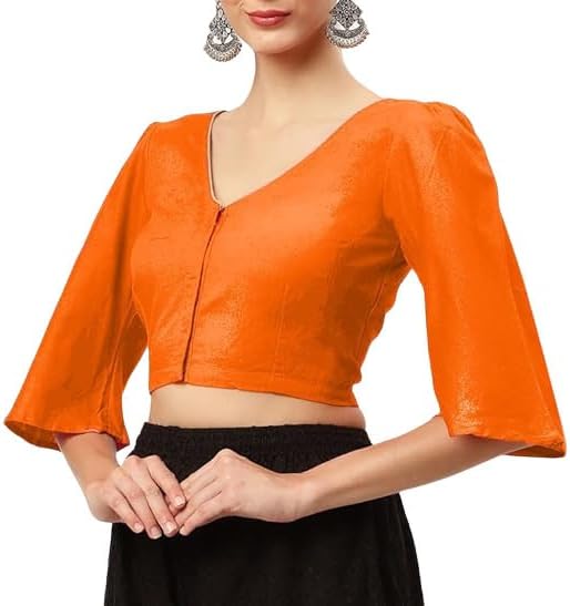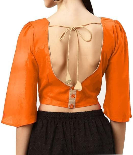 Readymade: The blouse is ready to wear, implying that it is pre-made and doesn’t require custom tailoring. This offers convenience and saves time for the wearer.Cotton Saree Blouse: The blouse is made of cotton, a popular fabric known for its comfort and breathability. Cotton is commonly used in traditional Indian clothing.Long Sleeve: The blouse is designed with long sleeves, offering more coverage. Long sleeves can add a touch of elegance and modesty to the outfit.V Neck: The blouse features a V-shaped neckline. V-necks are known for their flattering and elongating effect, creating a visually appealing look.Sari Choli Crop Top: The use of the terms “Sari Choli” and “Crop Top” suggests that the blouse is a modern and shorter version of the traditional saree blouse. Crop tops typically end above the waist, adding a contemporary and stylish element to the outfit.Overall, this readymade cotton saree blouse appears to combine traditional elements with modern fashion trends. The long sleeves and V-neck provide a classic touch, while the crop top style adds a contemporary flair. This blouse is likely suitable for women who want a blend of traditional and trendy elements in their saree attire.
