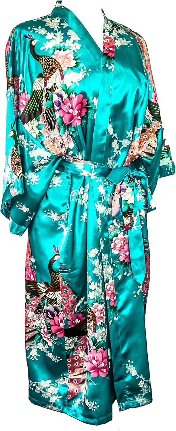 Our adult womens the ORIGINAL peacock print kimono robe with PREMIUM material and a crepe weave that CATCHES THE LIGHT to give a beautiful SATIN SHIMMER. Luxurious and comfortable, incredibly soft but still remains sensual silky and seductive, the perfect GIFT FOR HER.