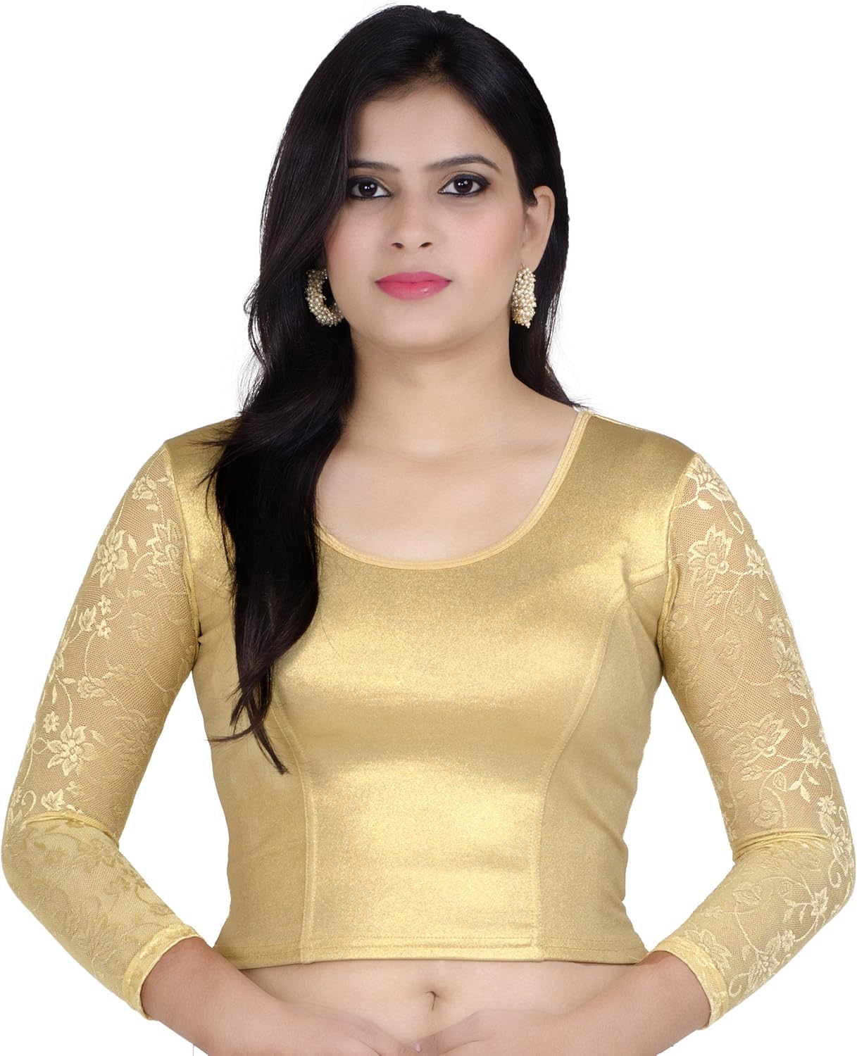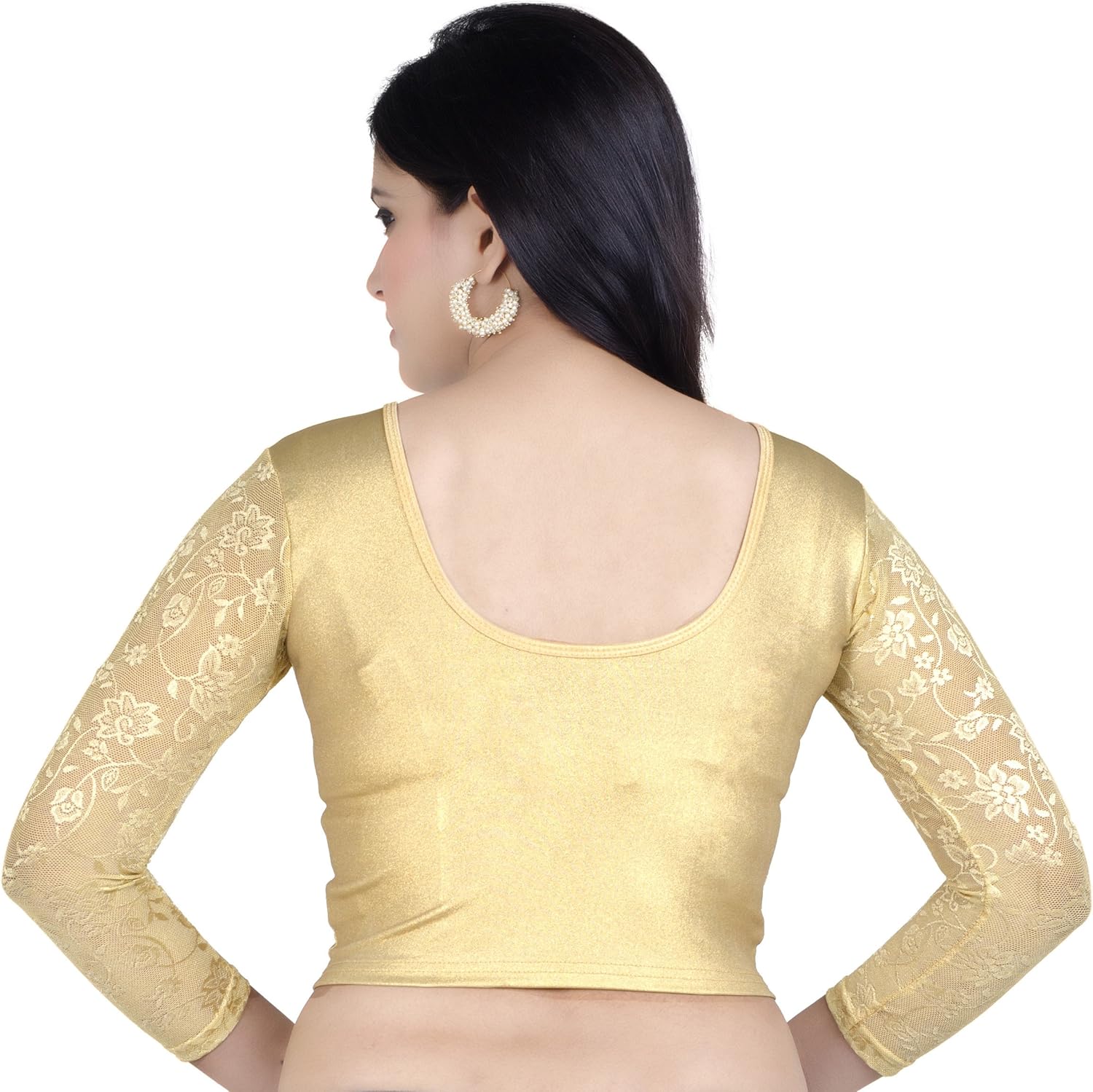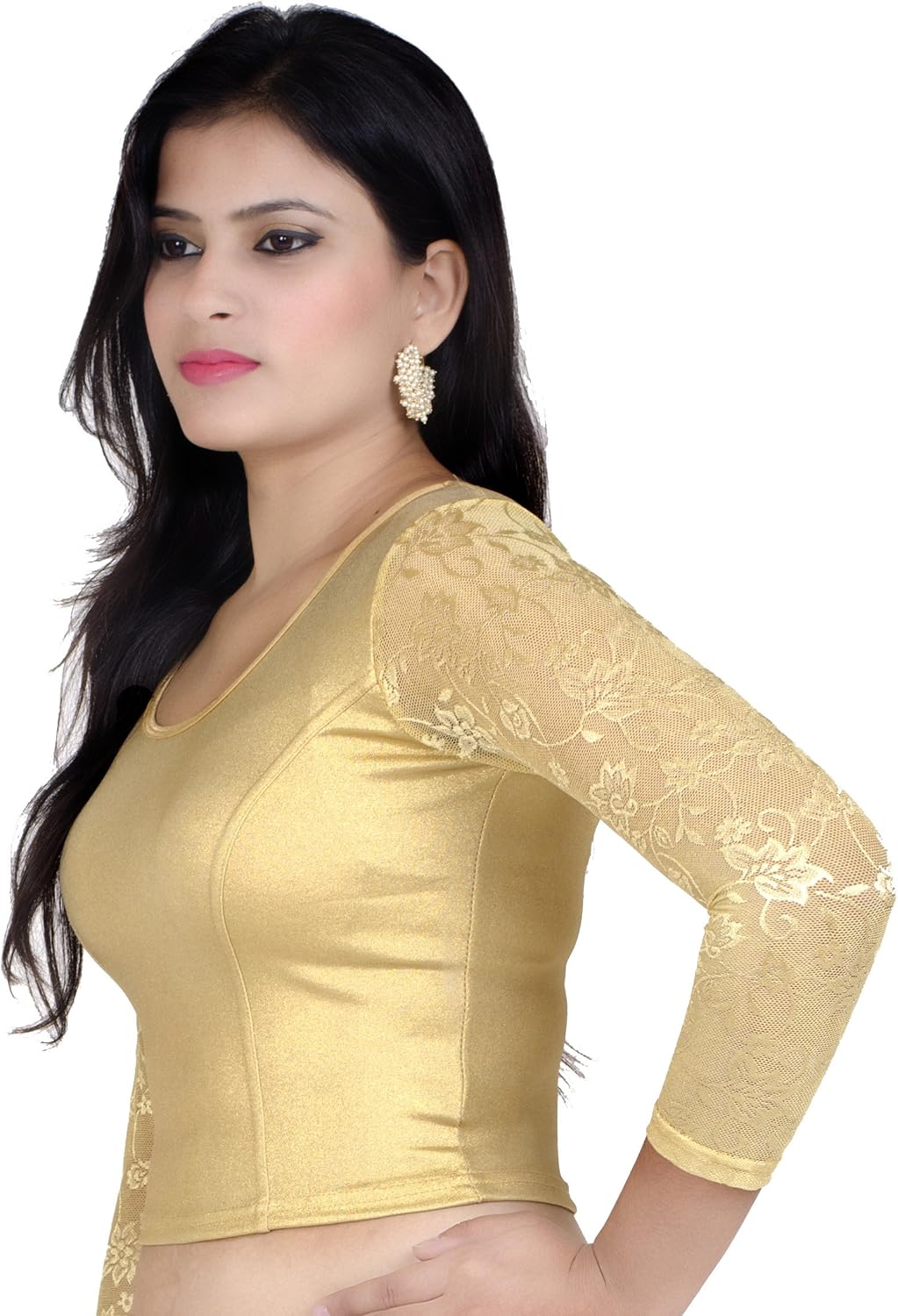 This Golden color Stretchable blouse has shiny fabric. It is long net sleeve and can be used regularly. If you wear red color net saree with this blouse, it will be fantastic. It will look expensive combination. It will shimmer more in night functions and will look rich.