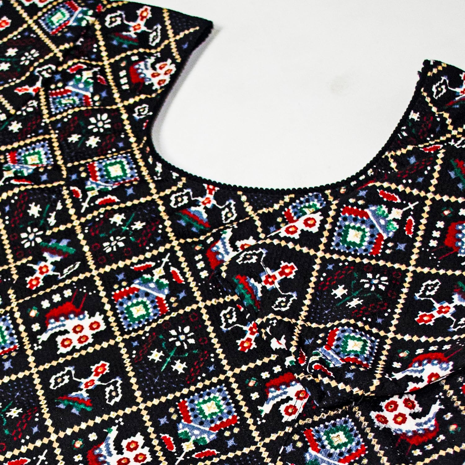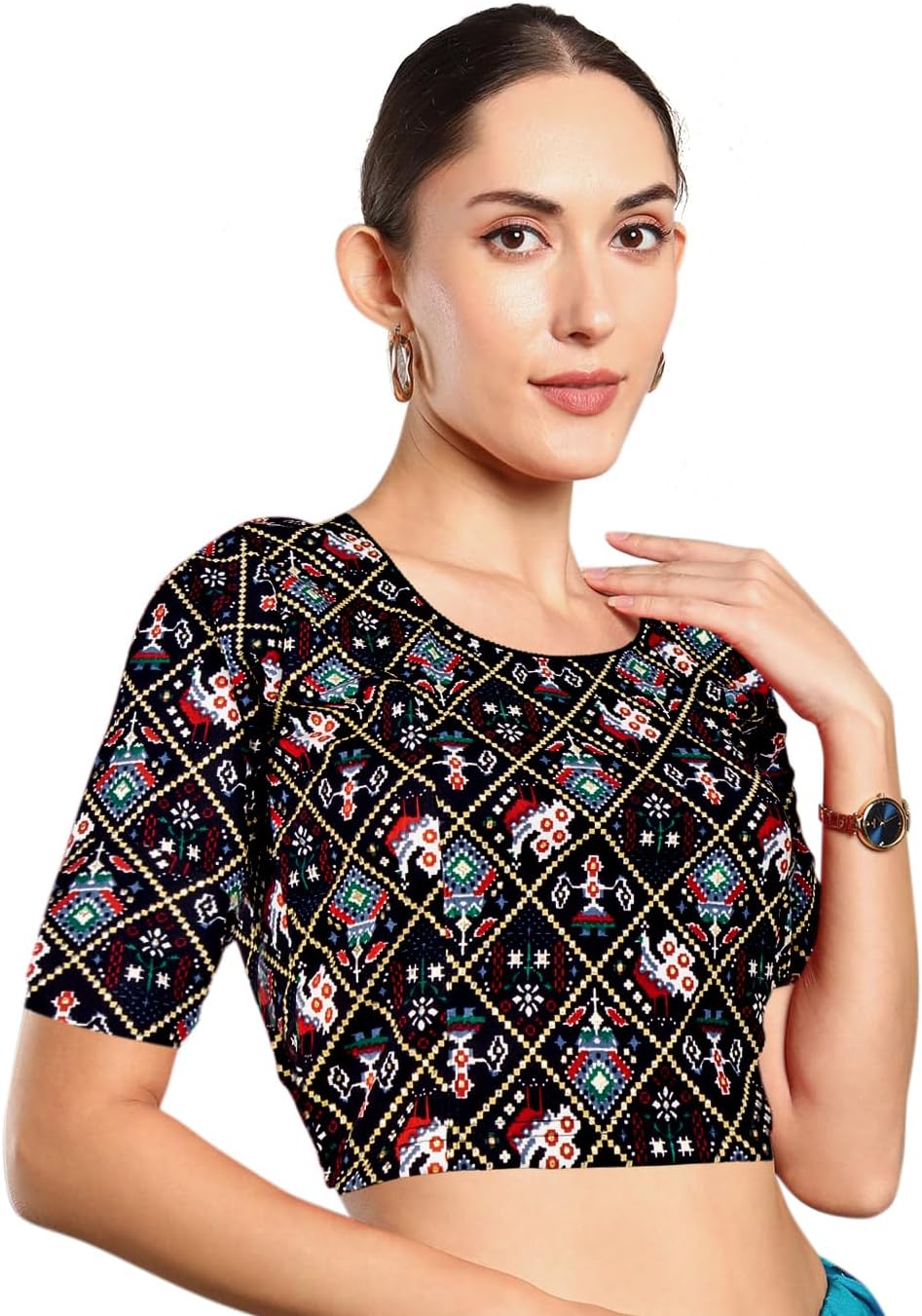The Bandhani print, a traditional tie-dye technique from India, gives the blouse a vibrant and ethnic look with intricate patterns that add a touch of cultural elegance.