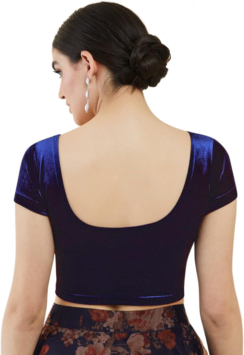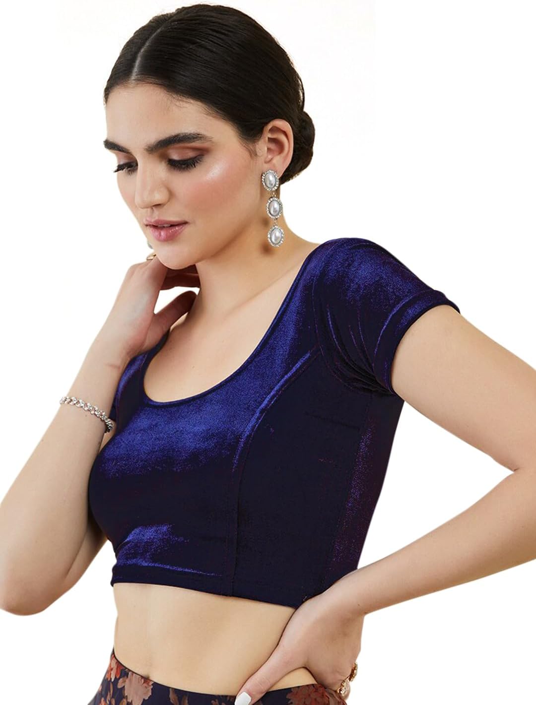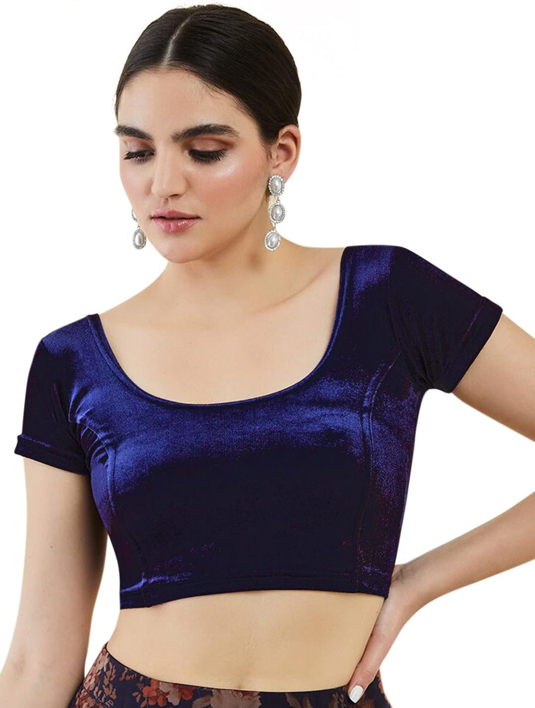 The shining texture of the velvet blouse makes it different from other fabric blouses. The short sleeves, a simple border on the broad U neckline gives it a regal look.