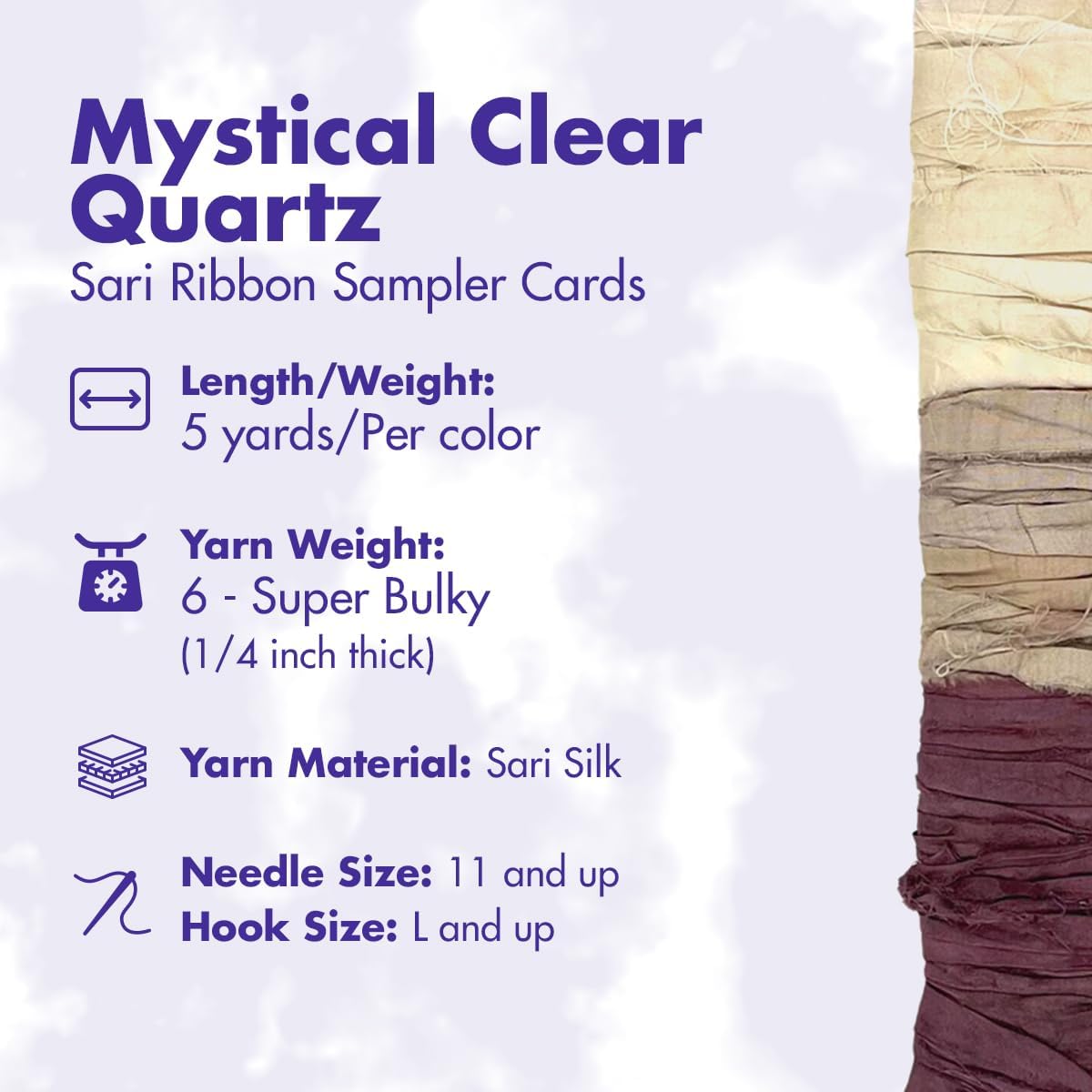 Spark your creative nature with our Sari Ribbon Sampler Cards. Explore different fibers, colors, and textures with each and every card, without having to commit to a full skein. 5 yards each of 3 colors. Ideas: Knitting, crocheting, weaving, spinning with your favorite fiber, wrapping presents