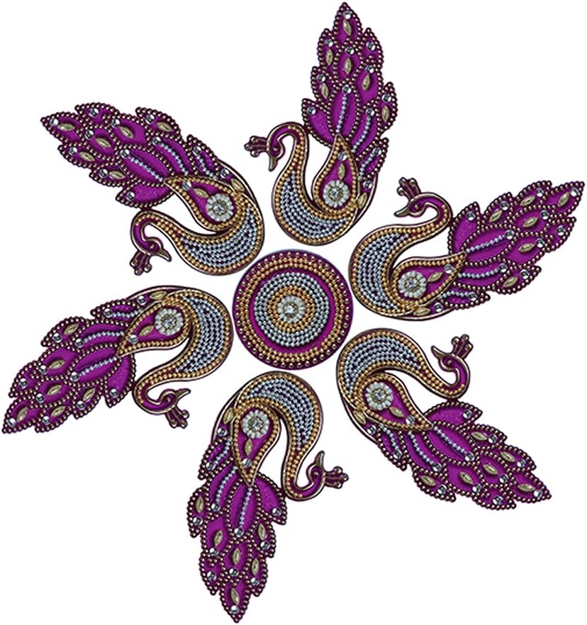 Product :- Peacock Design Rangoli Material :-Acrylic Kundan & Stone, Size :- 9″ Inches Diameter, Color :- Purple