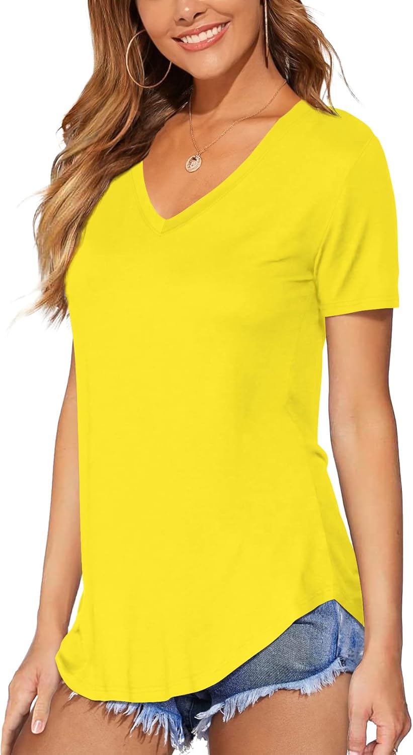 Features: V neck, short sleeve, with rounded bottom hem, casual, plain basic tees, soft and loose.