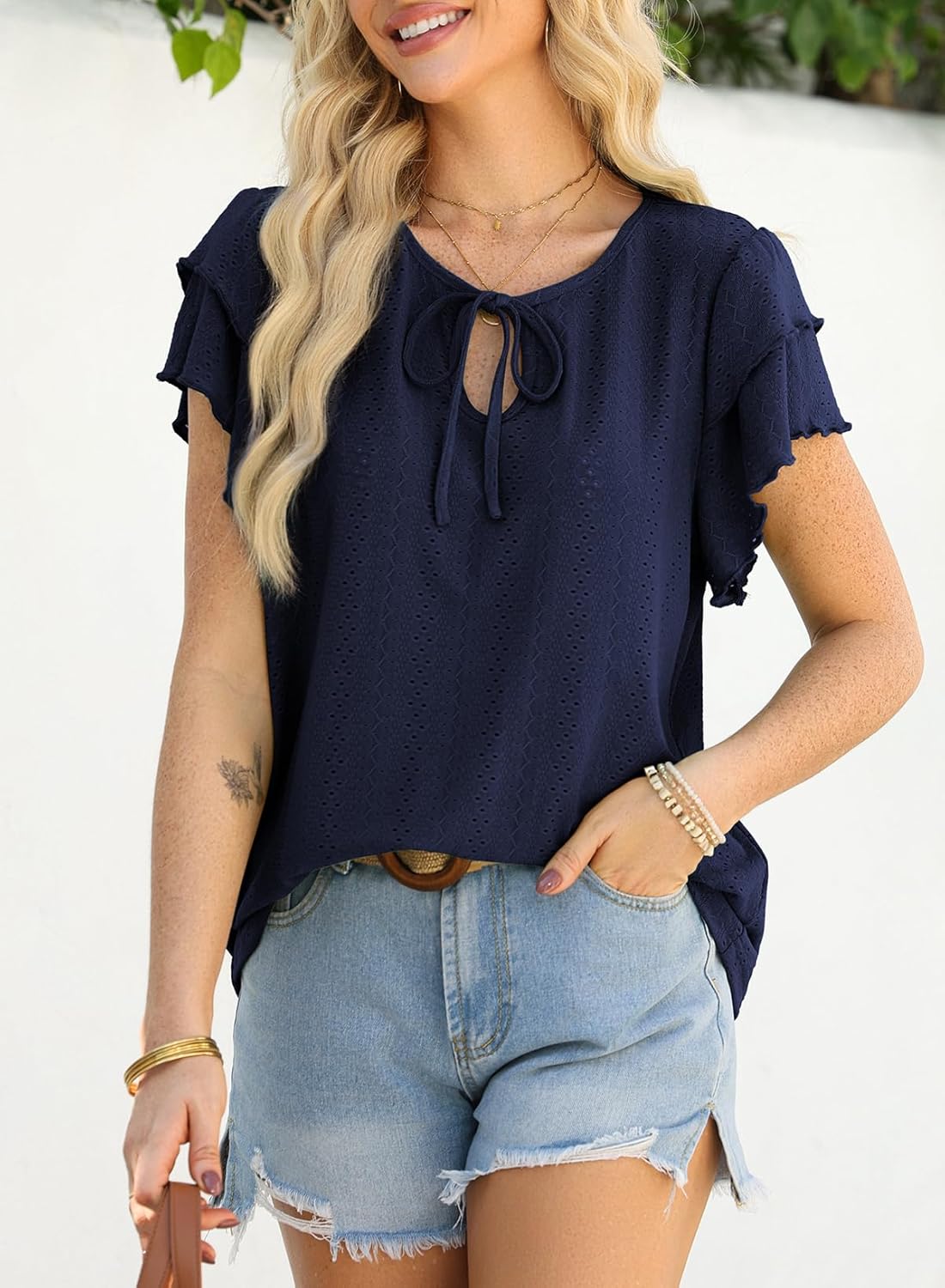 Design: Featuring delicate eyelet patterns, this top adds a touch of femininity and elegance. The ruffle sleeves provide a playful and trendy look, while the tie neckline offers adjustable comfort. These thoughtful design elements make it both stylish and functional, suitable for various body types.