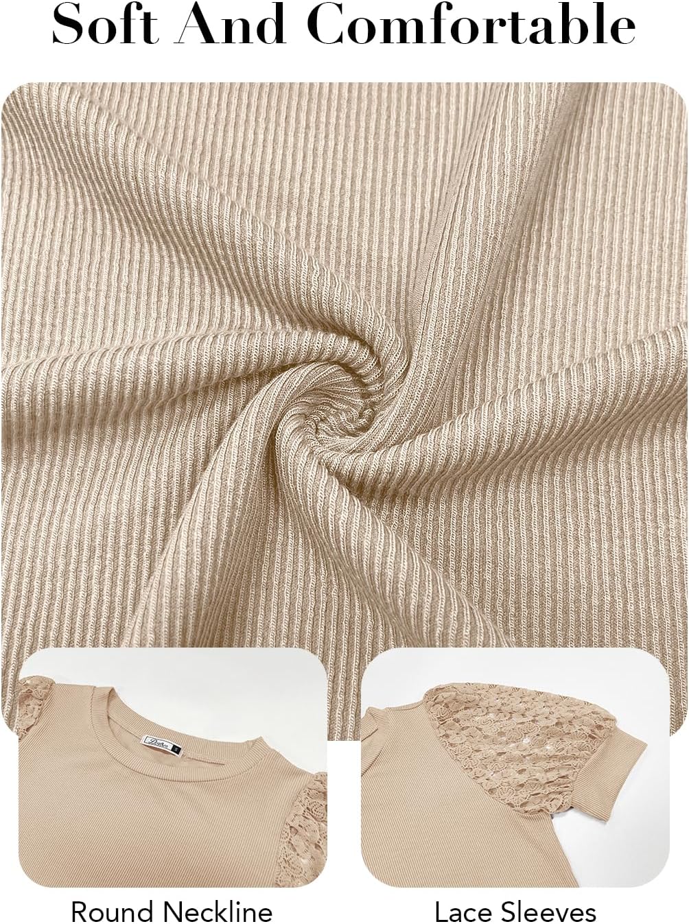 Ribbed knit fabrication and beautiful lace detailing at the short puff sleeve makes it flattering and will have you covered from work to the weekend.