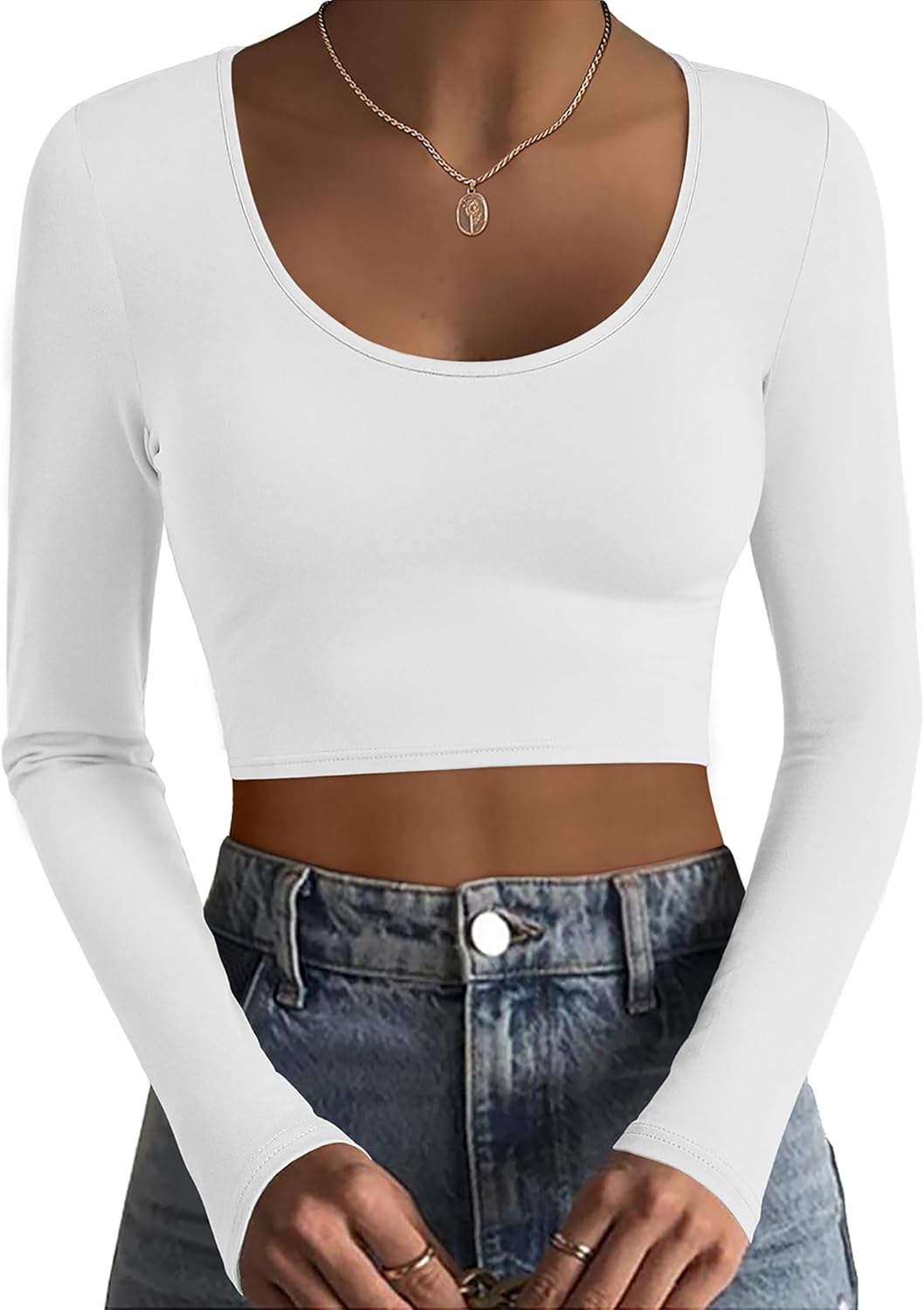 Features a unique scoop neck design, cropped length, long sleeve, solid colors, well made and slim fit but not too tight.