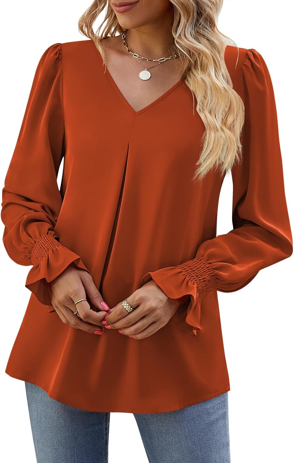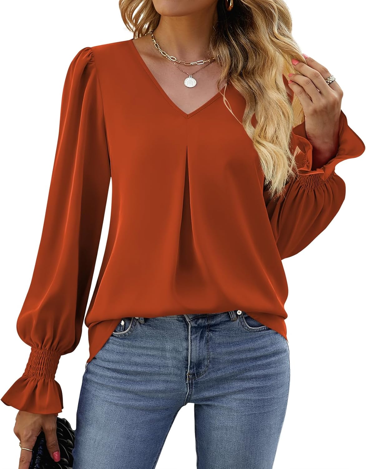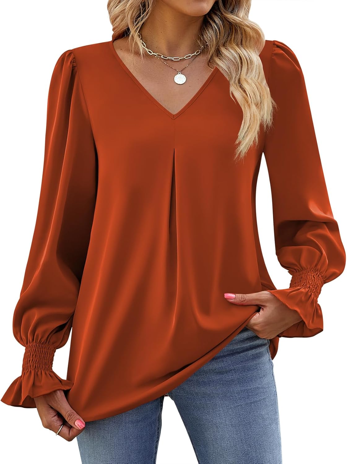 Funlingo Women’s 2024 Long Sleeve Tops Dressy Casual V Neck Tunic Shirts Loose Chiffon Work Blouse