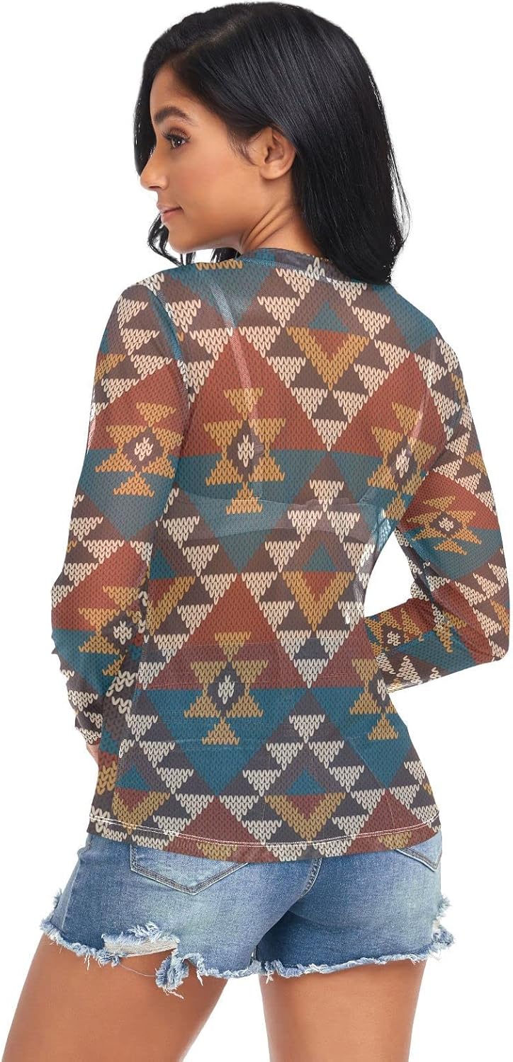 Long Sleeve, Round Neck, Hollow Out, Mesh Blouse, Stretch Tops, All Over Print