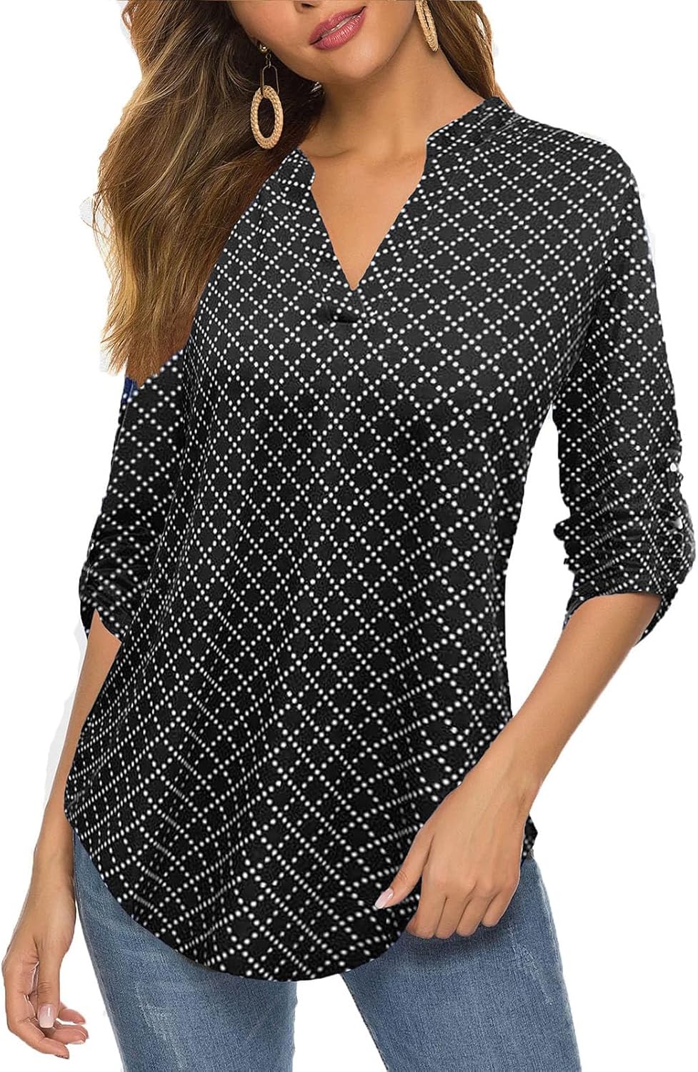 Halife Women’s Roll Up 3/4 Sleeve Tops Dressy Casual V Neck Tunic Blouses