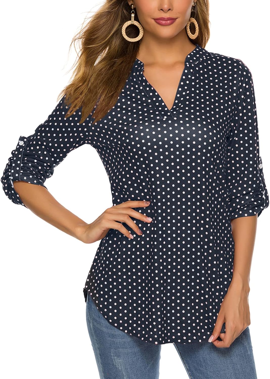 Halife Women’s Roll Up 3/4 Sleeve Tops Dressy Casual V Neck Tunic Blouses