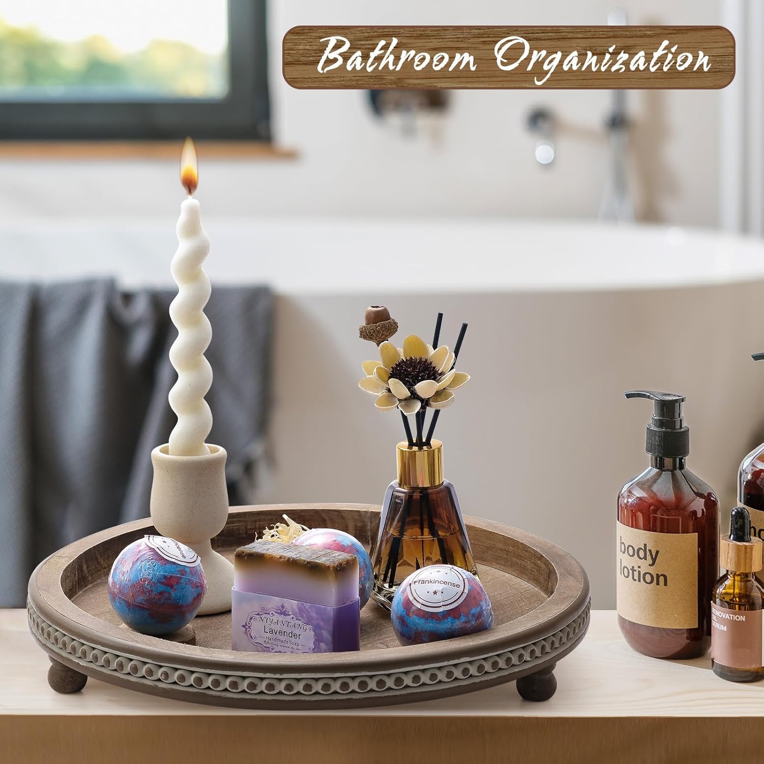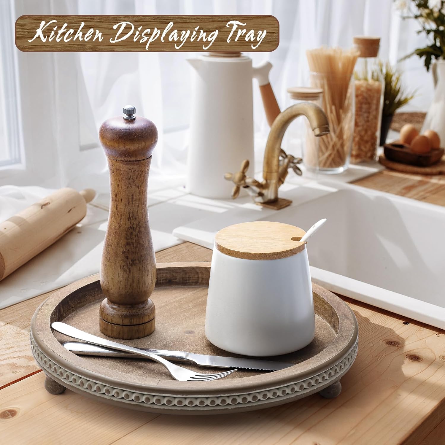 WELL-CONSTRUCTED& PERFECT SIZE:Each table tray is meticulously crafted from high-quality wood with meticulous attention to detail. The solid wood construction ensures long-lasting durability, while the exquisite finish adds an elegant touch to your home decor. Measuring approximately 12″L x 12″W x 1.75″H, this round tray is perfect for everyday use and decoration, providing you with unparalleled convenience.