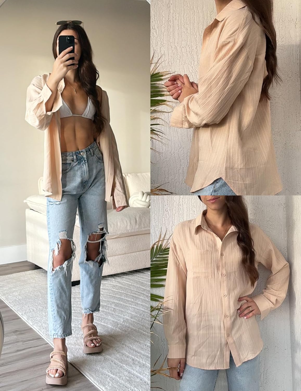 HOTOUCH Casual Womens Button Down Shirt Loose Long Sleeve Blouse 2024