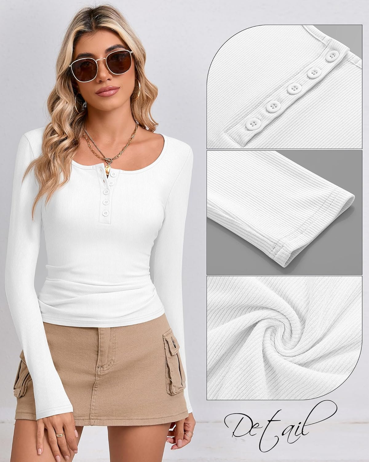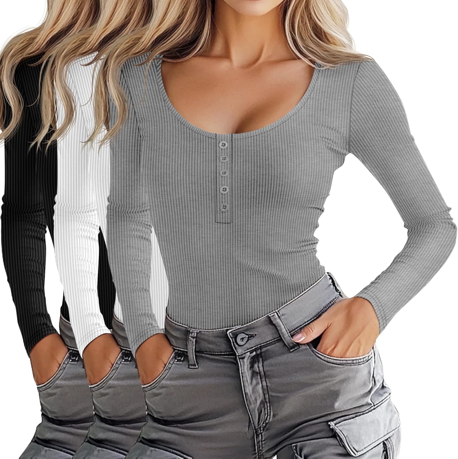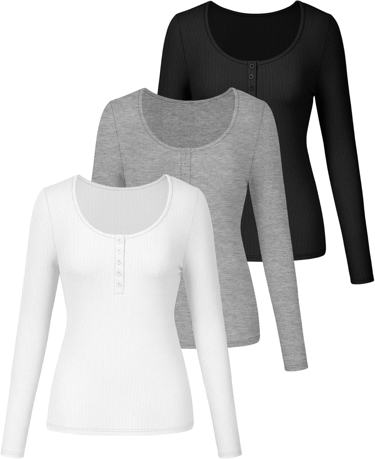 Huukeay 3 Packs Women’s Long Sleeve Shirts Fall Henley Tops Button Down Crew Neck Slim Fit Ribbed Knit Casual Basic Blouse