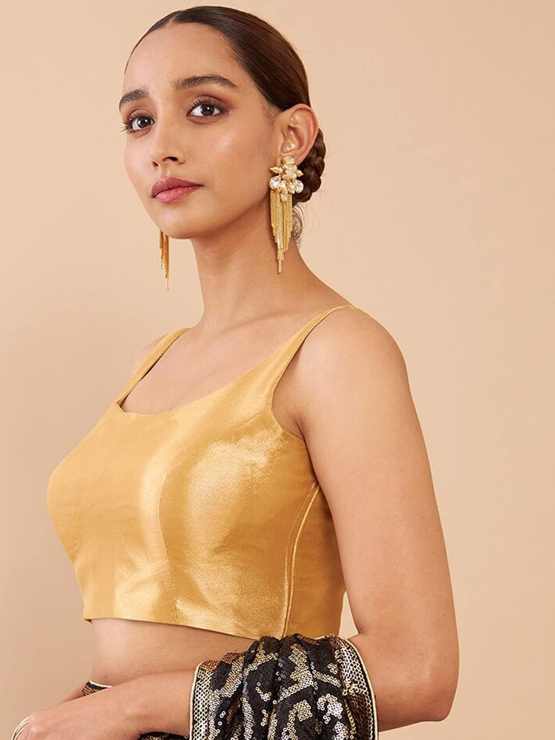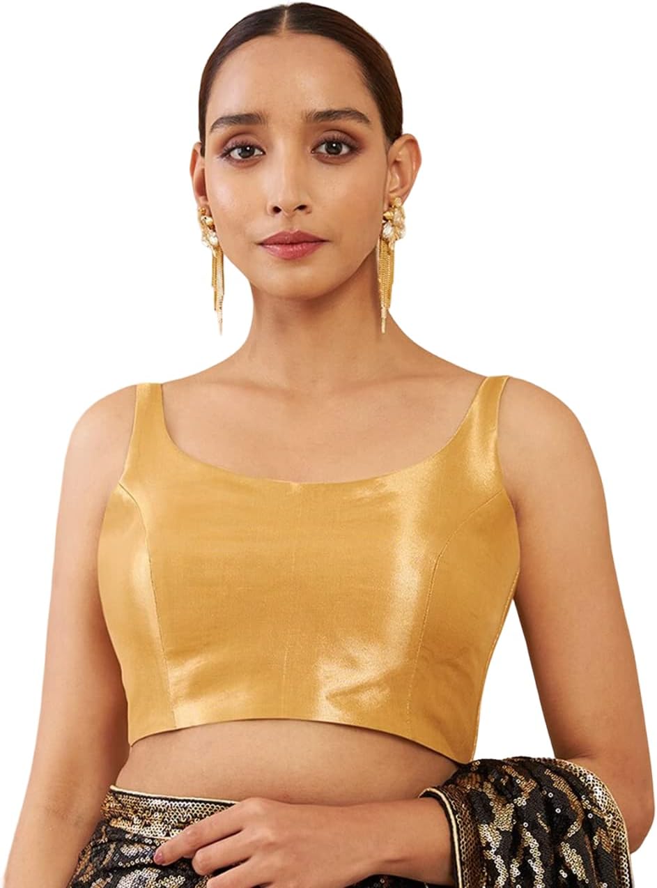 Women solid saree blouse has a round neck, sleeveless, and hook and eye closure at the back