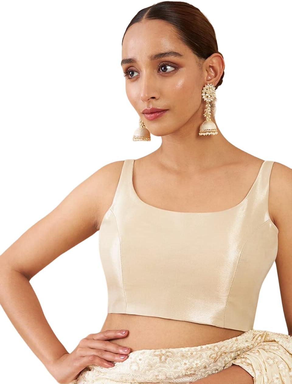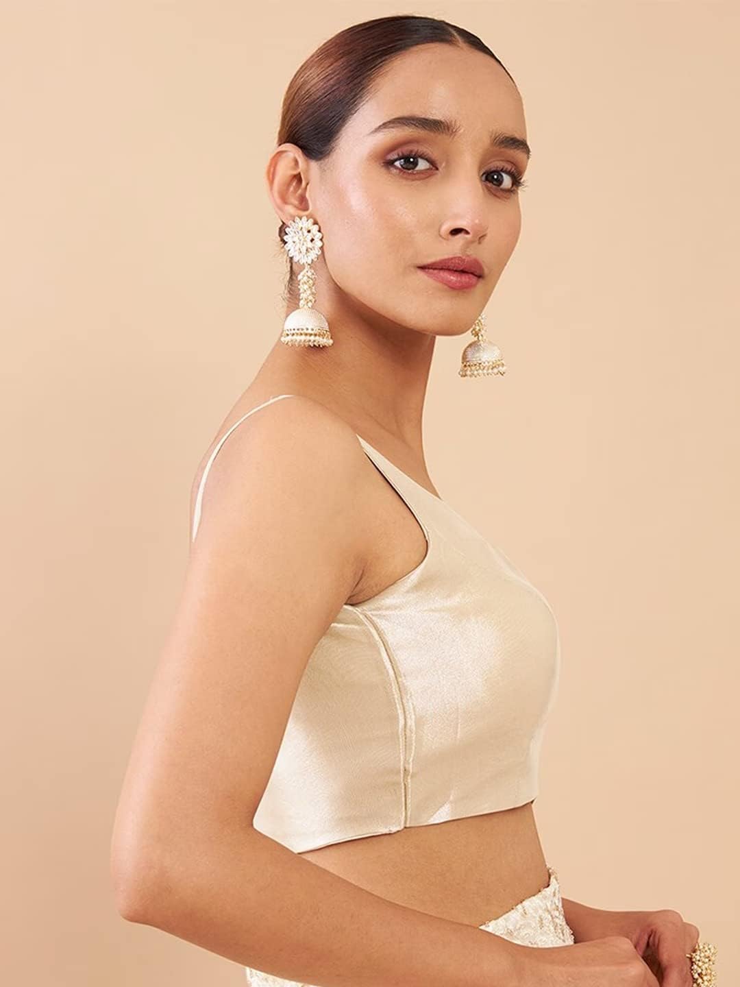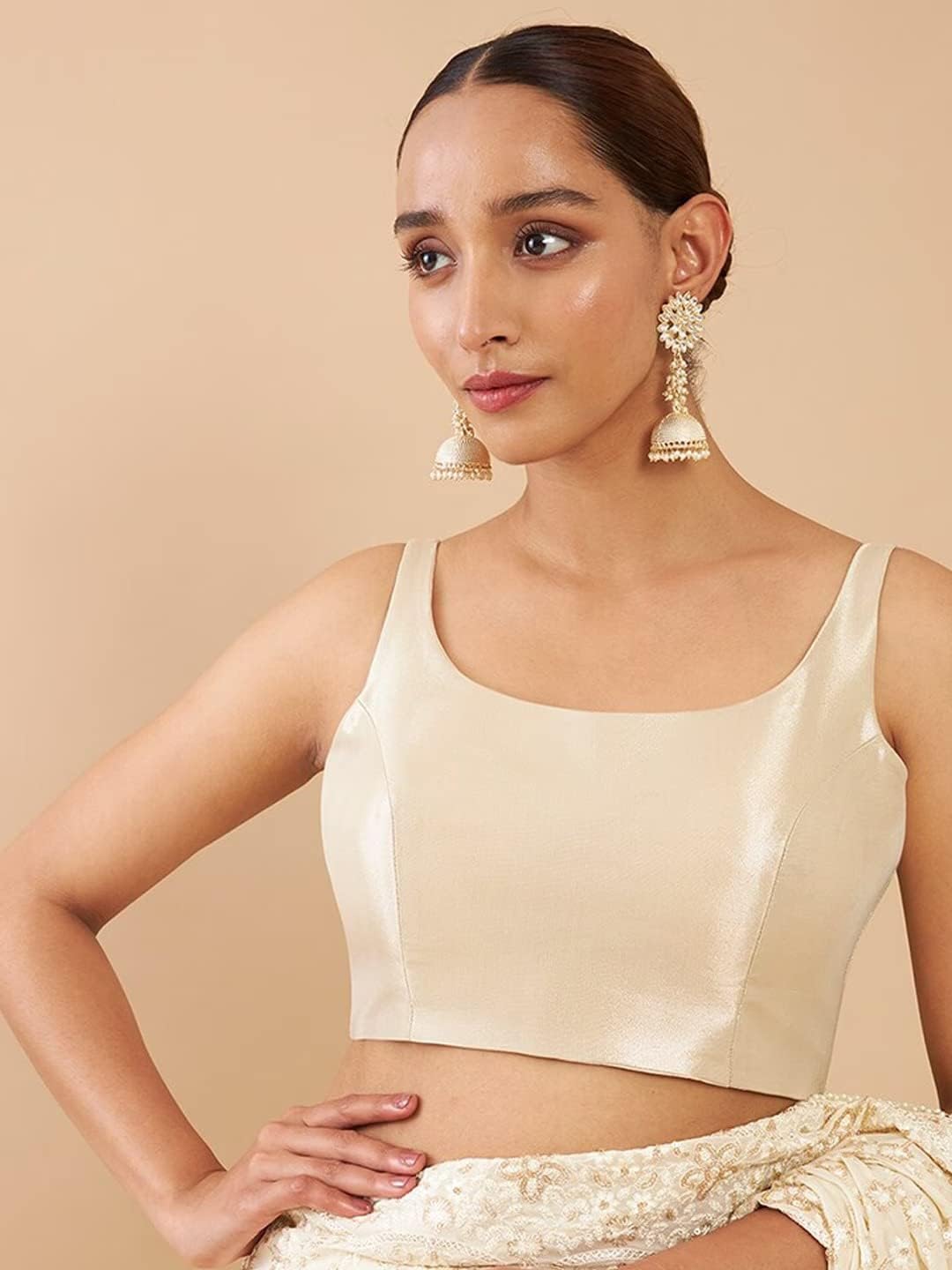 Women solid saree blouse has a round neck, sleeveless, and hook and eye closure at the back