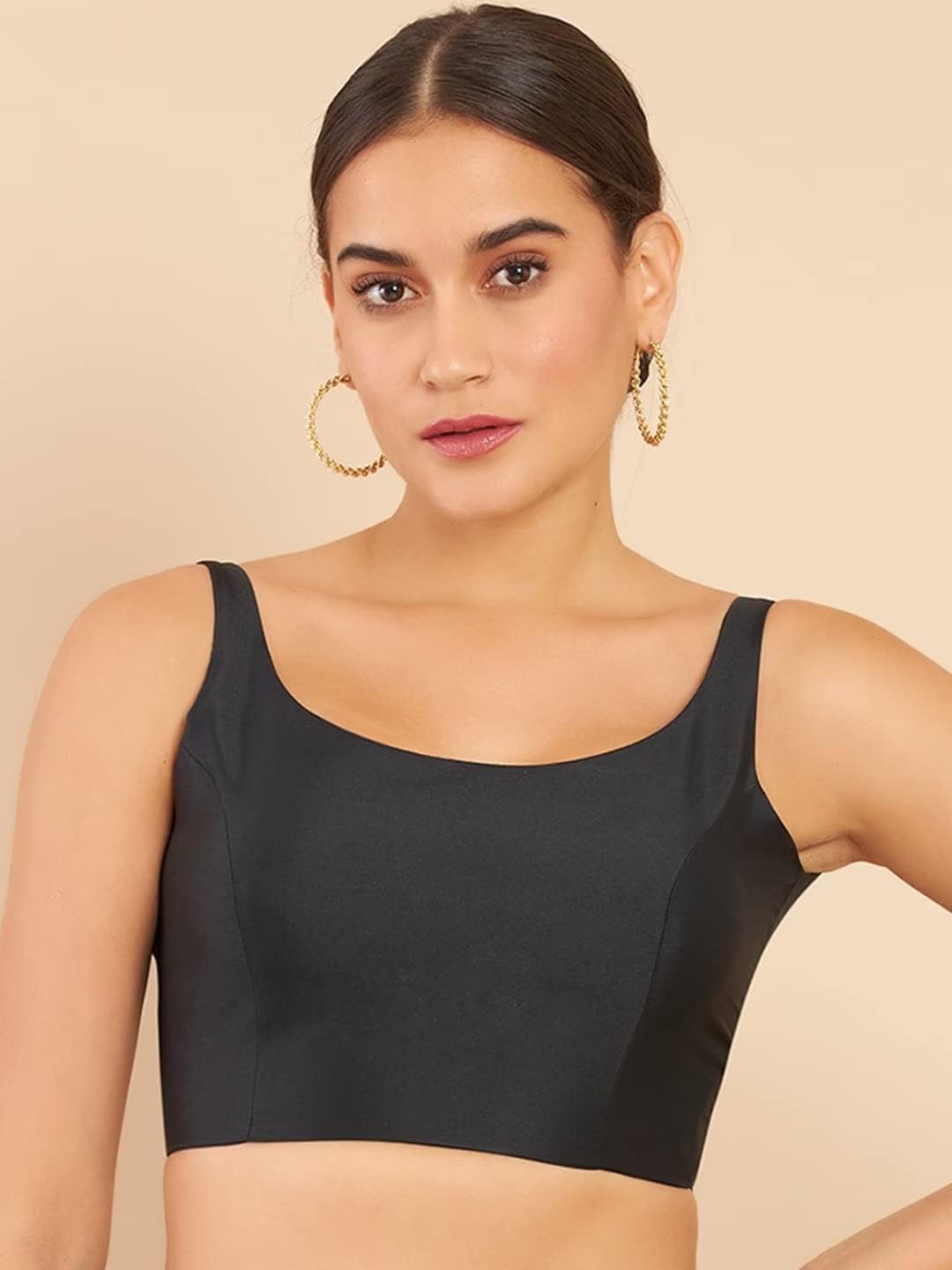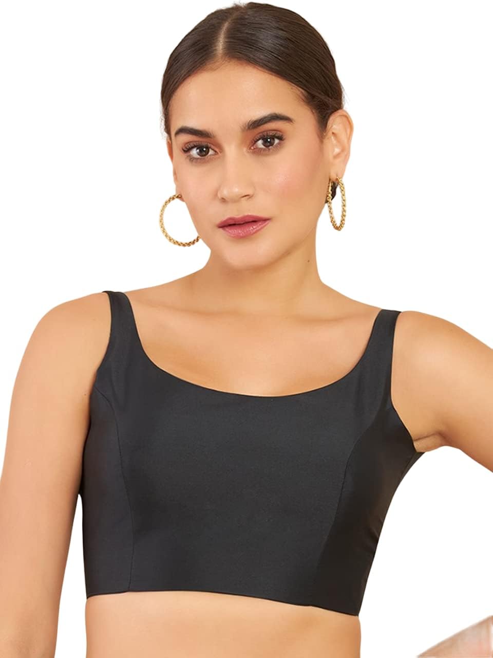 Women solid saree blouse has a round neck, sleeveless, and hook and eye closure at the back