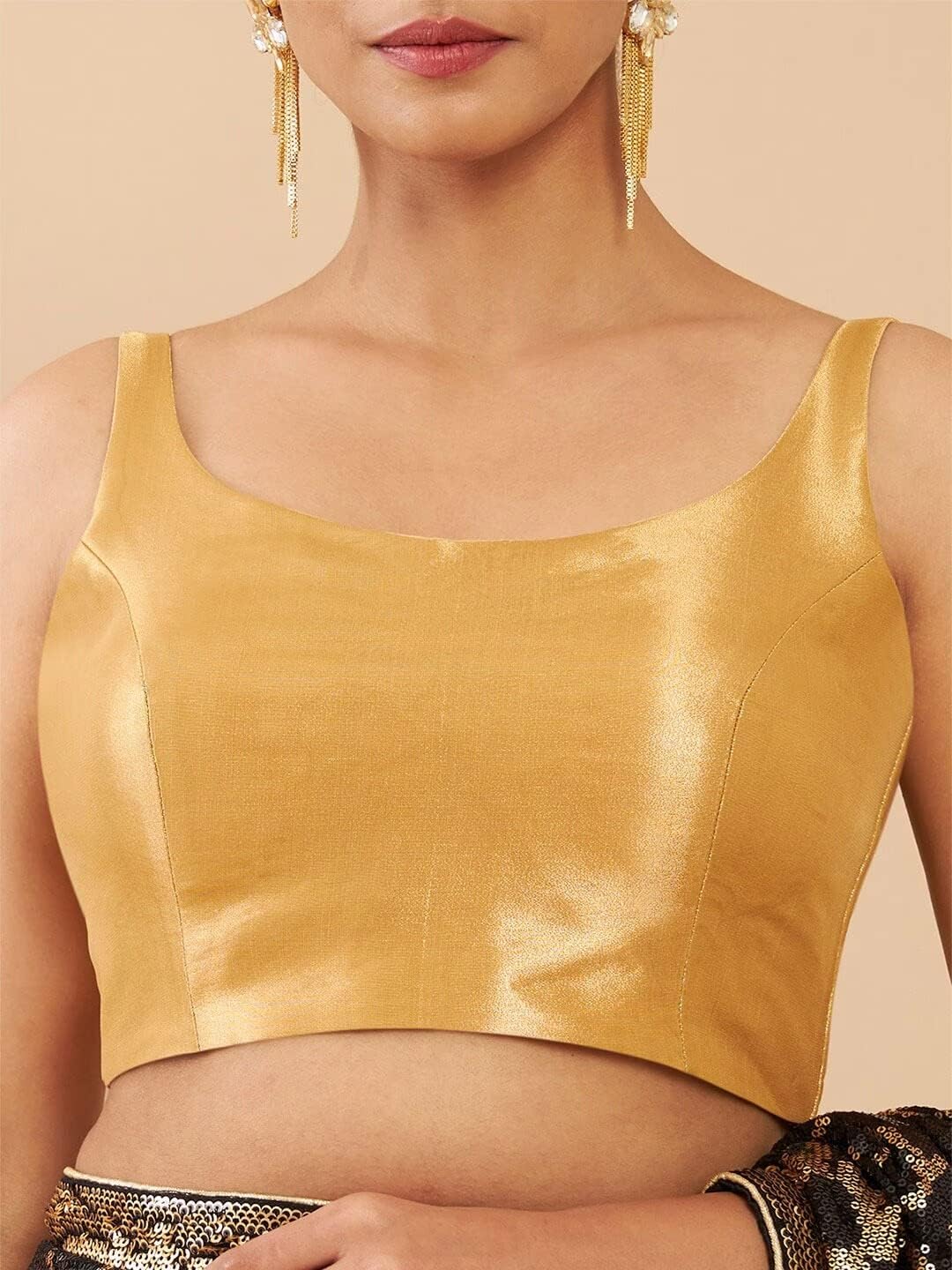 Women solid saree blouse has a round neck, sleeveless, and hook and eye closure at the back