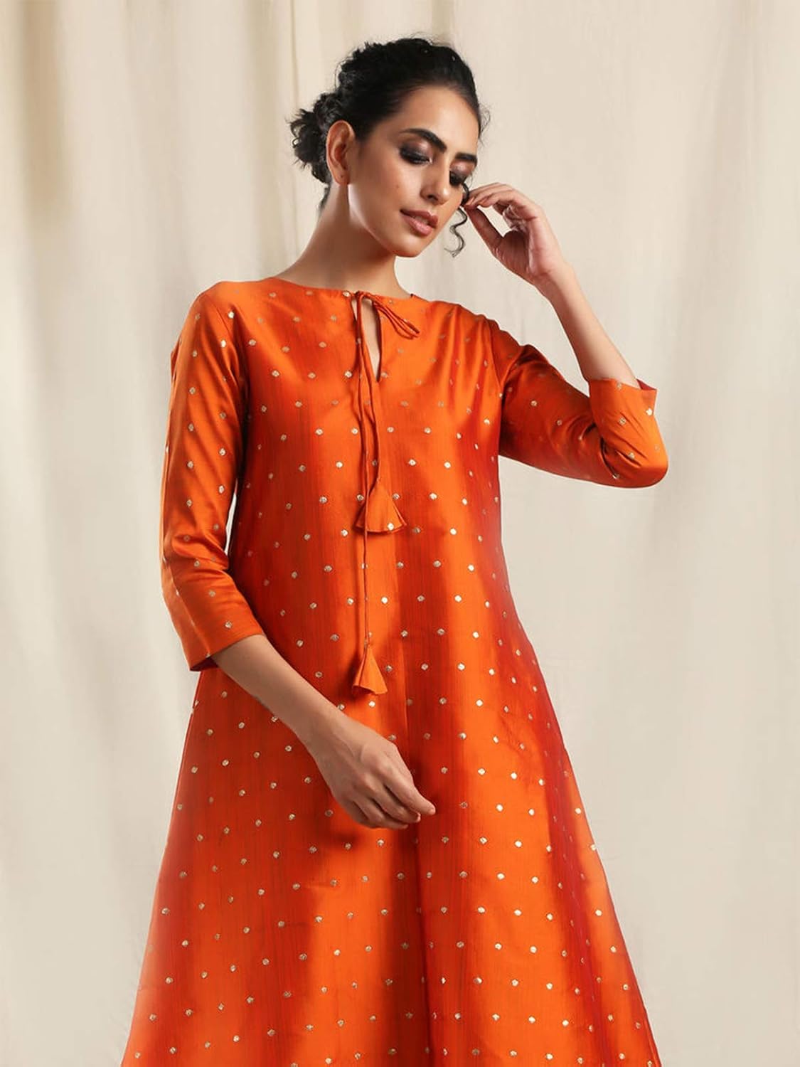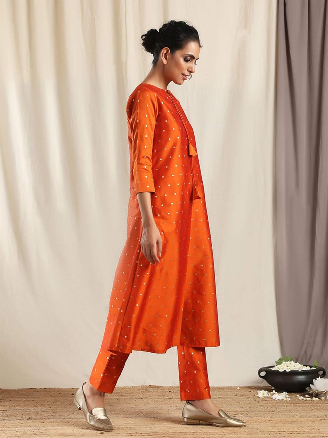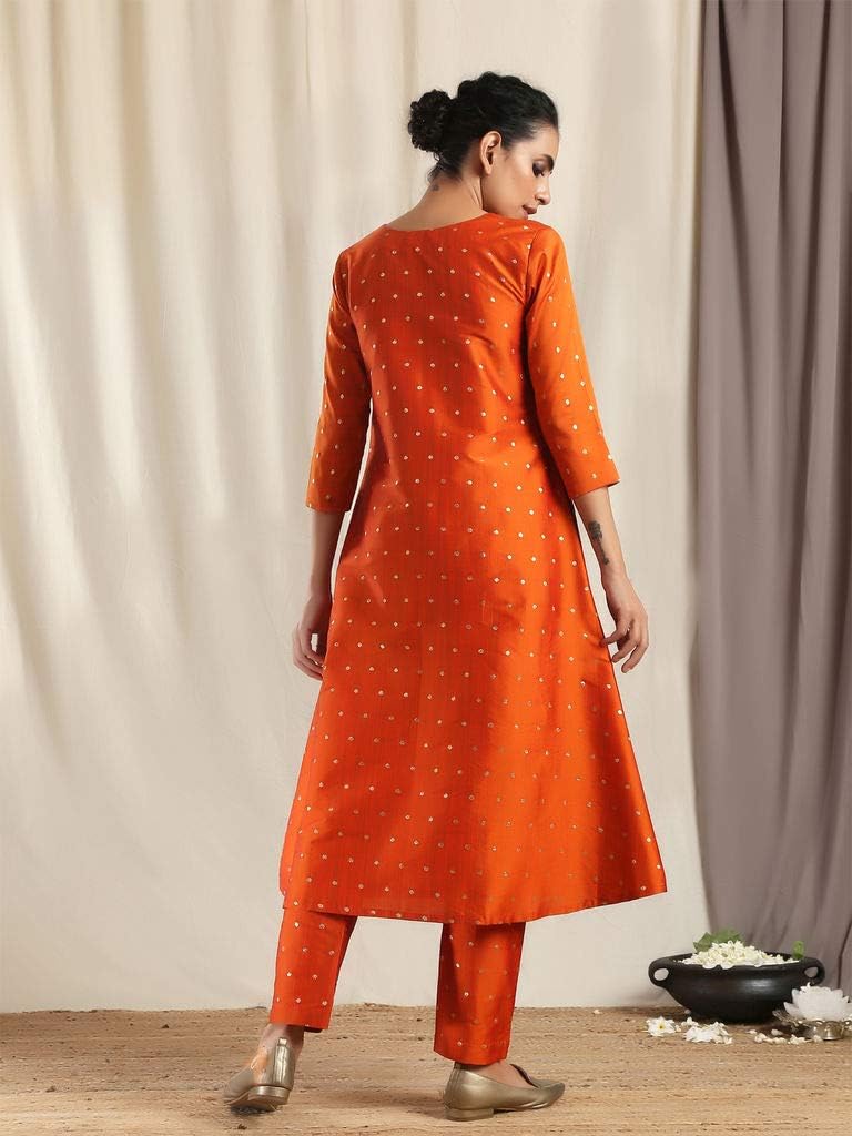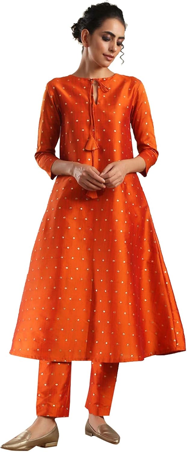 Wear it for any other festivity and be the soul of the occasion with this foil printed kurta. The slim fit style and pants make it a must-have pair for the woman who wants to look unique.