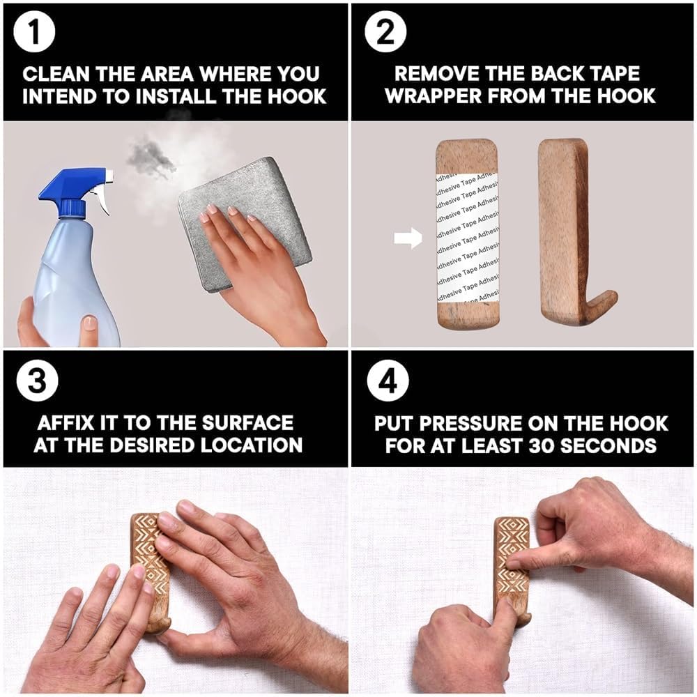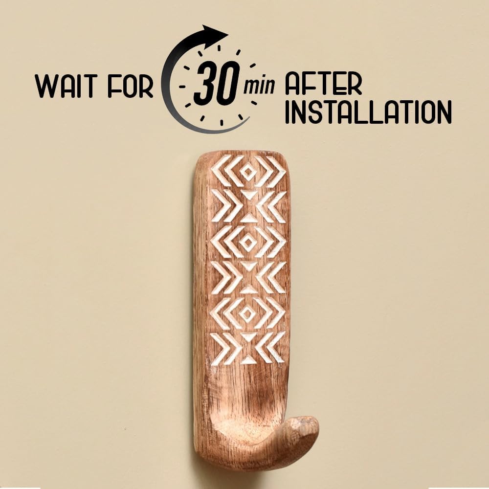 Package Contents- 3 Piece Premium Wooden Hooks for Wall and 3 Non- Trace Strong Adhesive Strips. Installation- Easily Peel and Stick on the Wall and Press for 30 Seconds, You are Ready to Go.