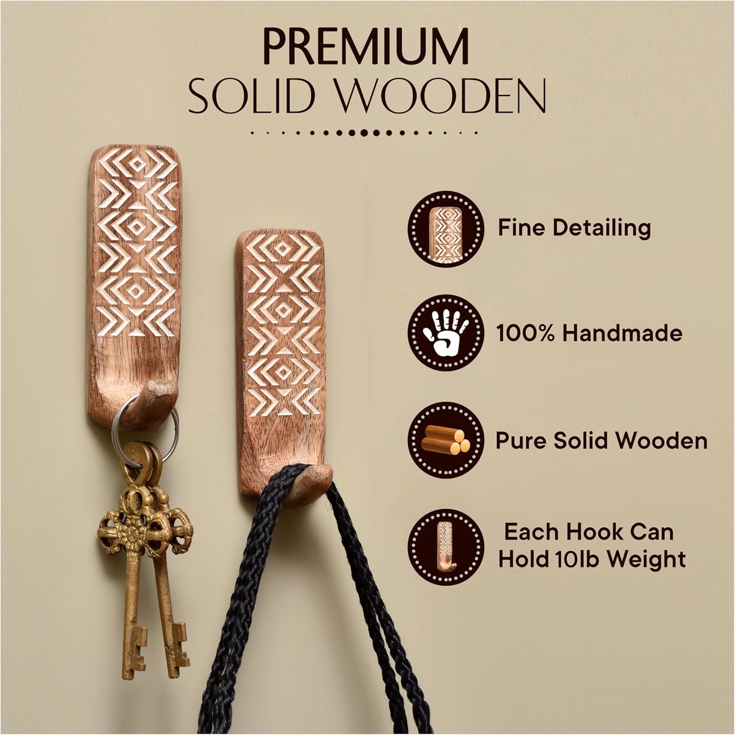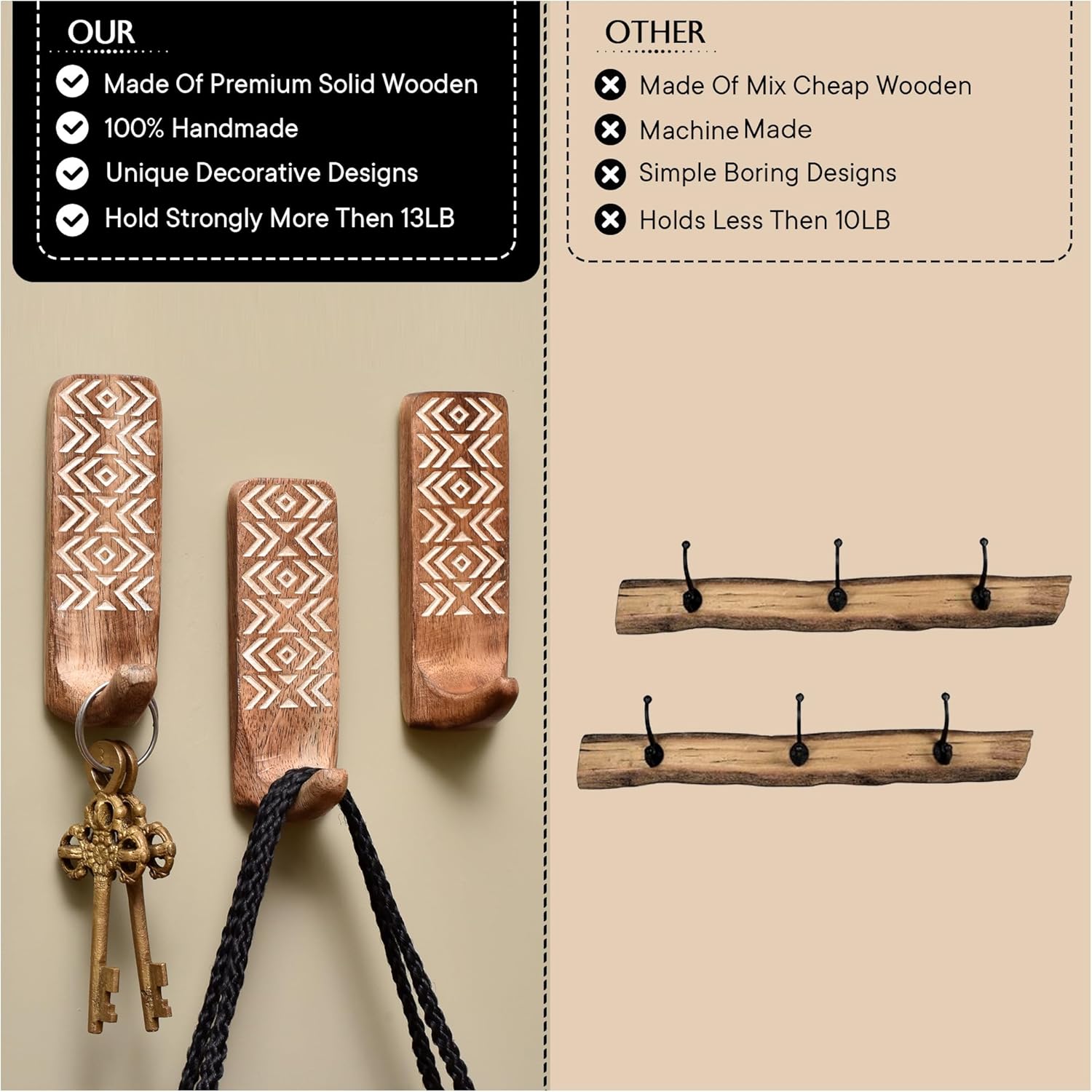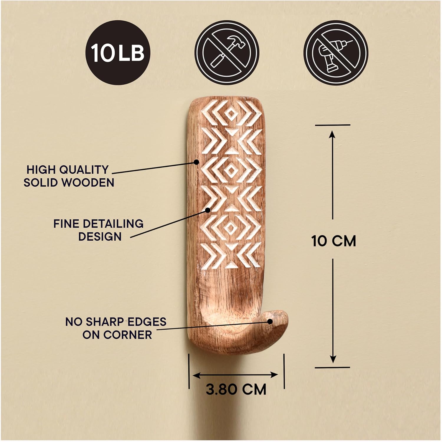 Unique Design- The Eye-Catching Self Adhesive Hooks with a Handmade Wooden Boho Design are Perfect for Bringing Attention to Detail to the Living Room, Bedrooms, Kitchen and Bathroom.