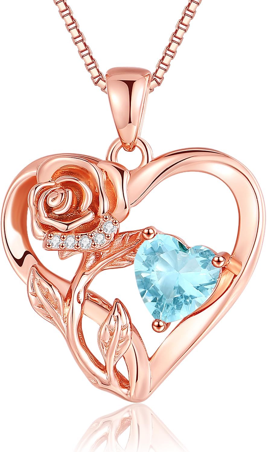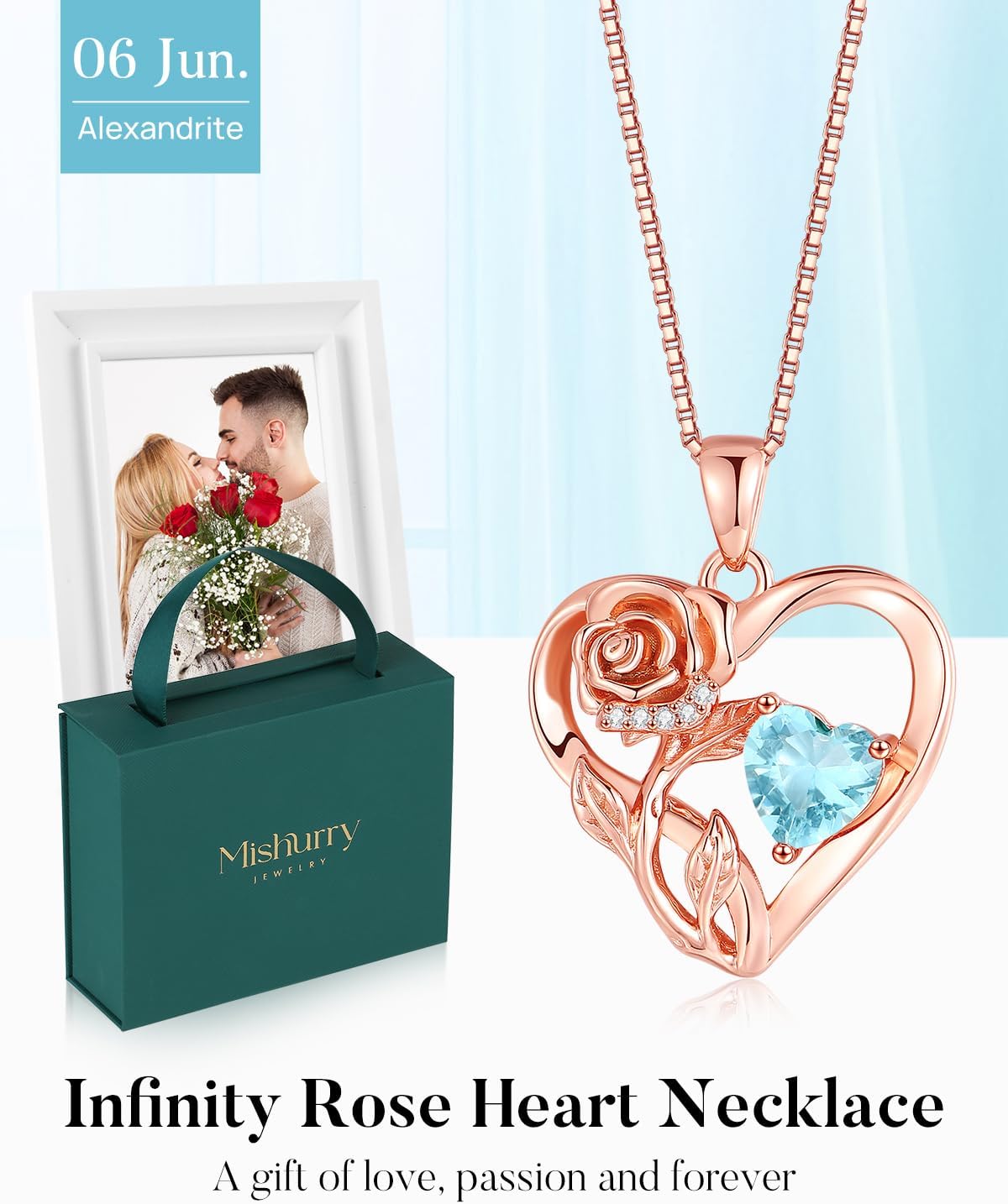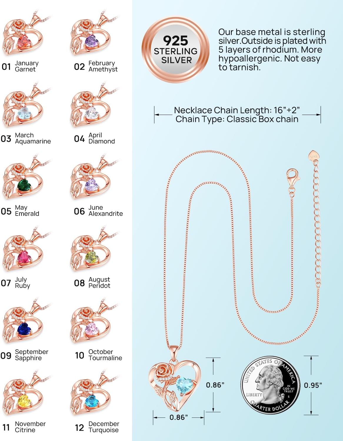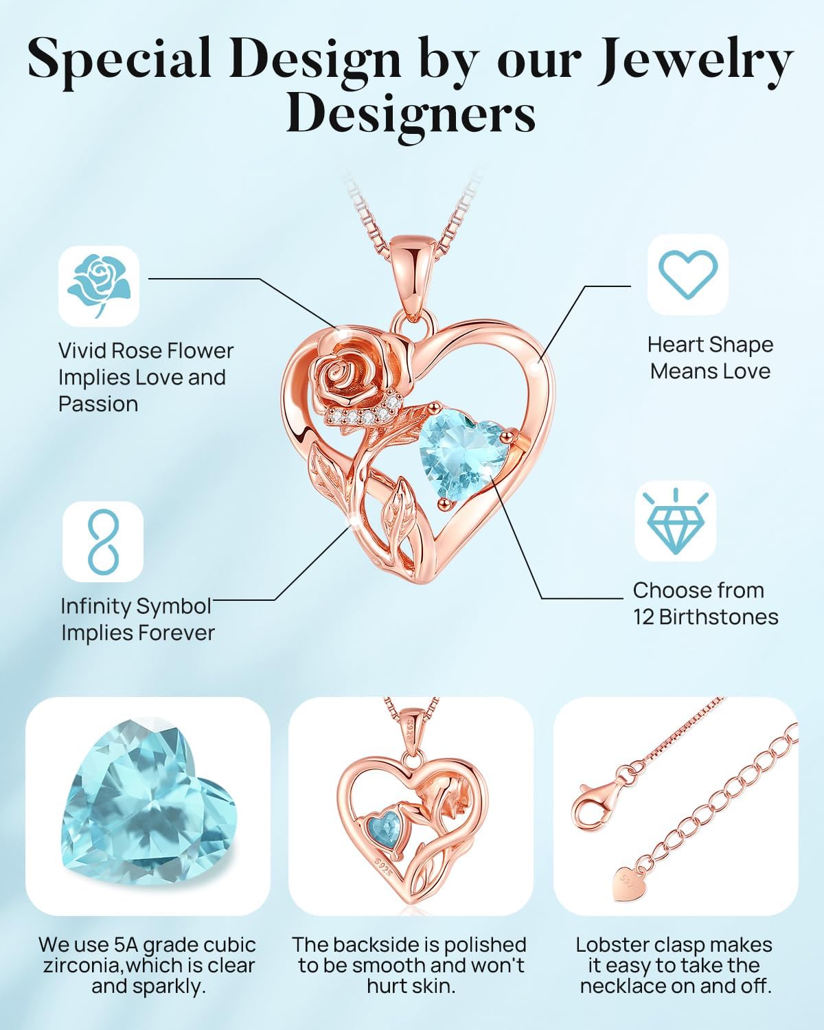 The rose flower necklace for women features a vivid rose flower with stem which forms an infinity symbol with the left heart curve. Right sits the heart diamond stone, which can be chosen from 12 colors.