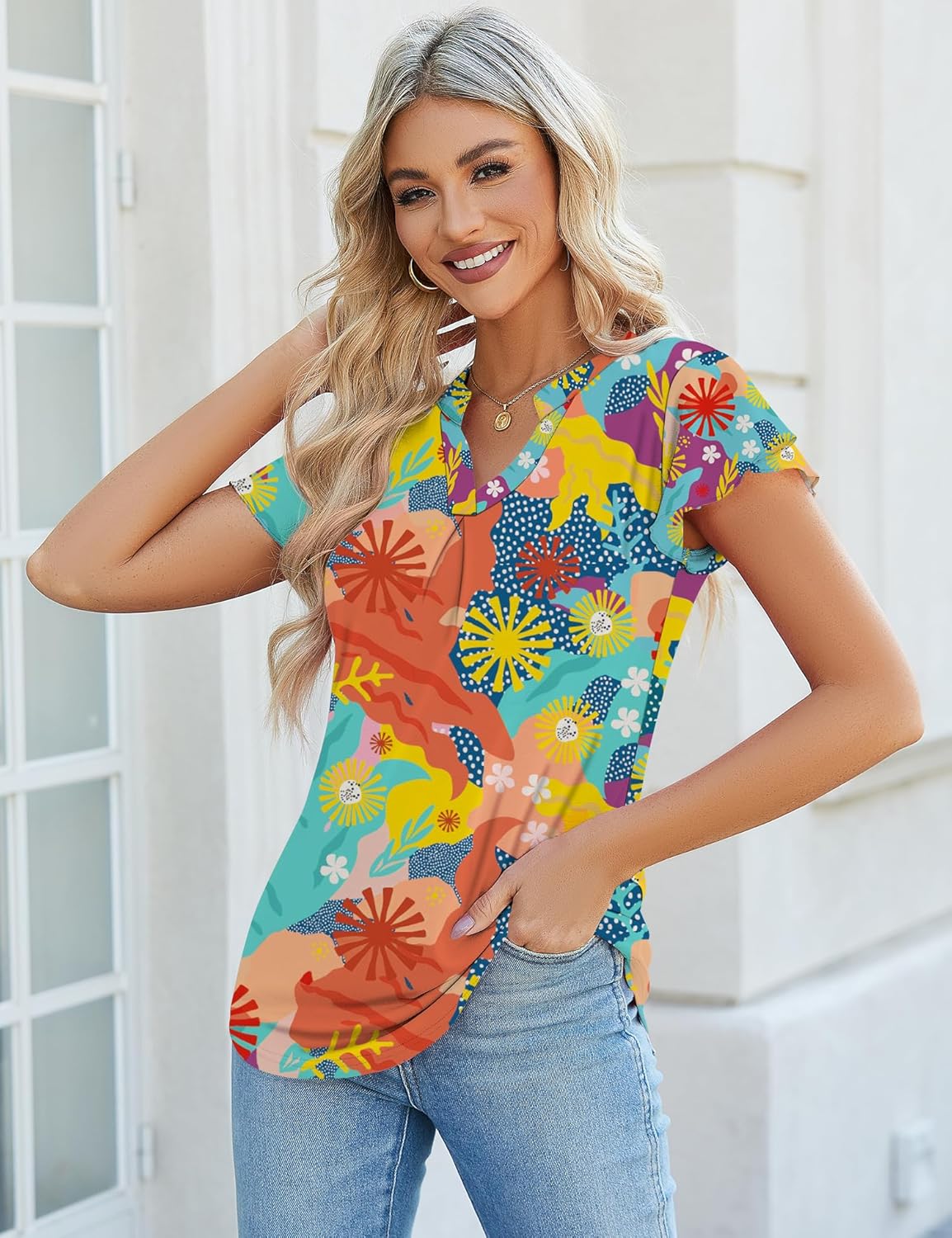 Women’s Casual Summer Boho Floral Printed V Neck Tops