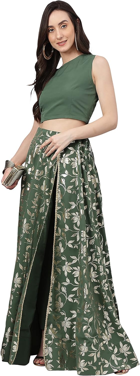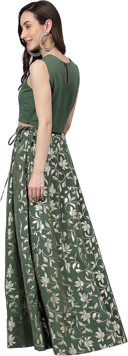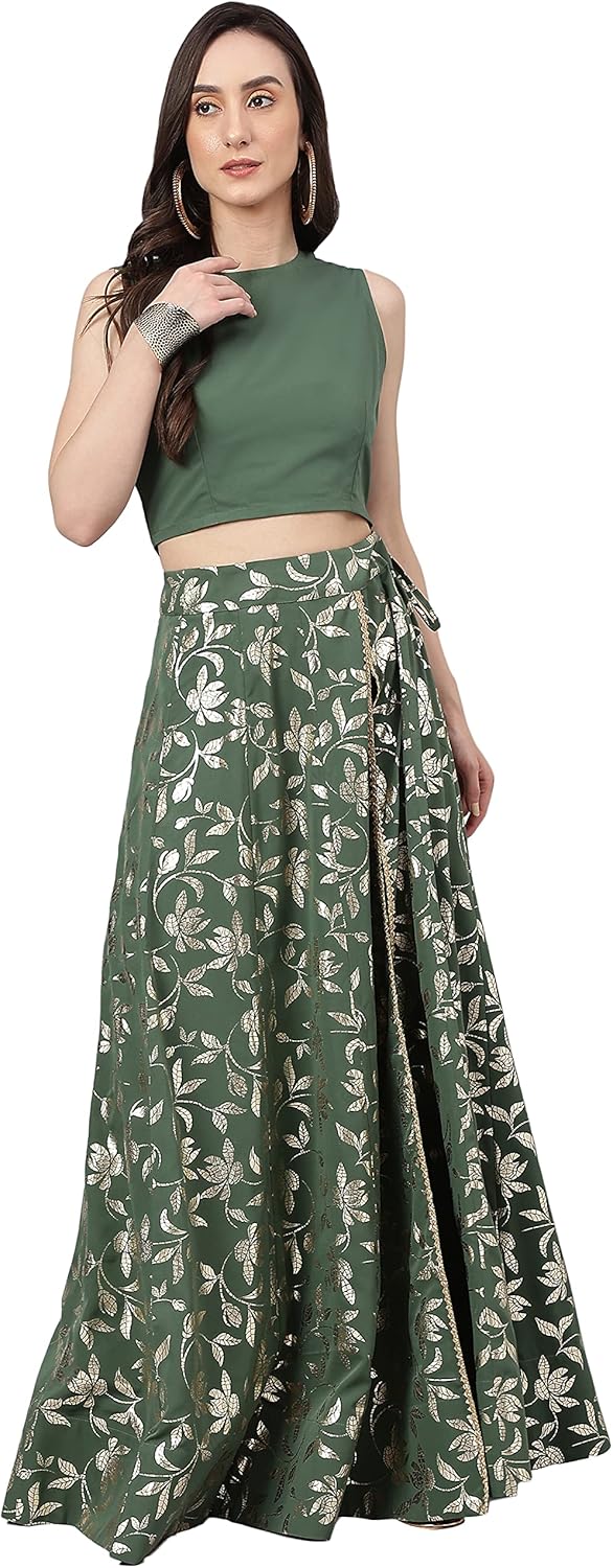 Janasya Indian Women’s Olive Green Foil Printed Crepe Lehenga Choli With Pant
