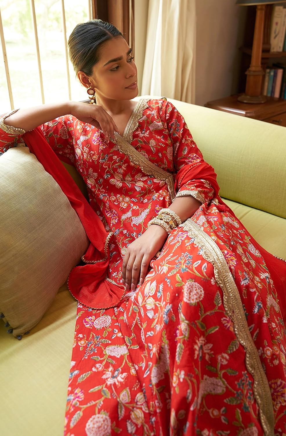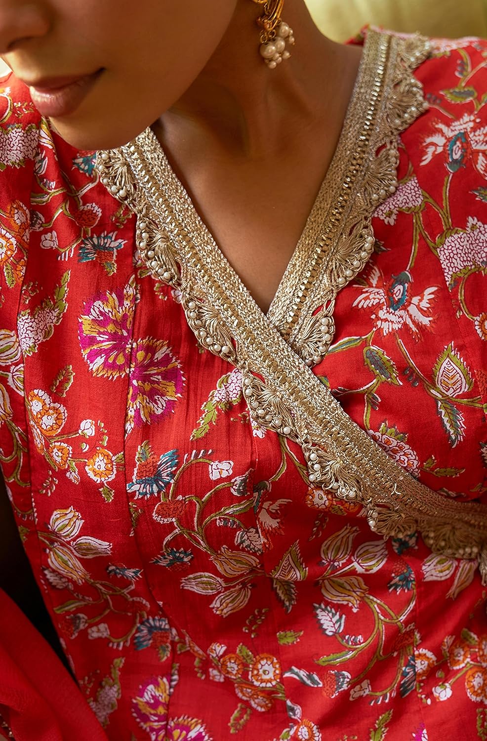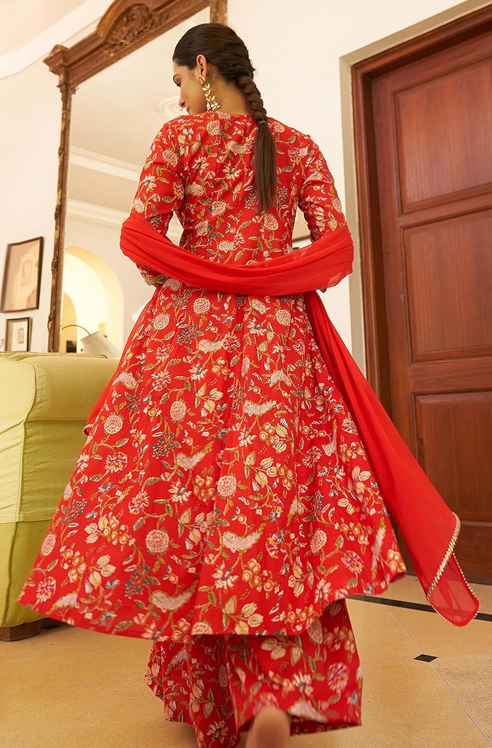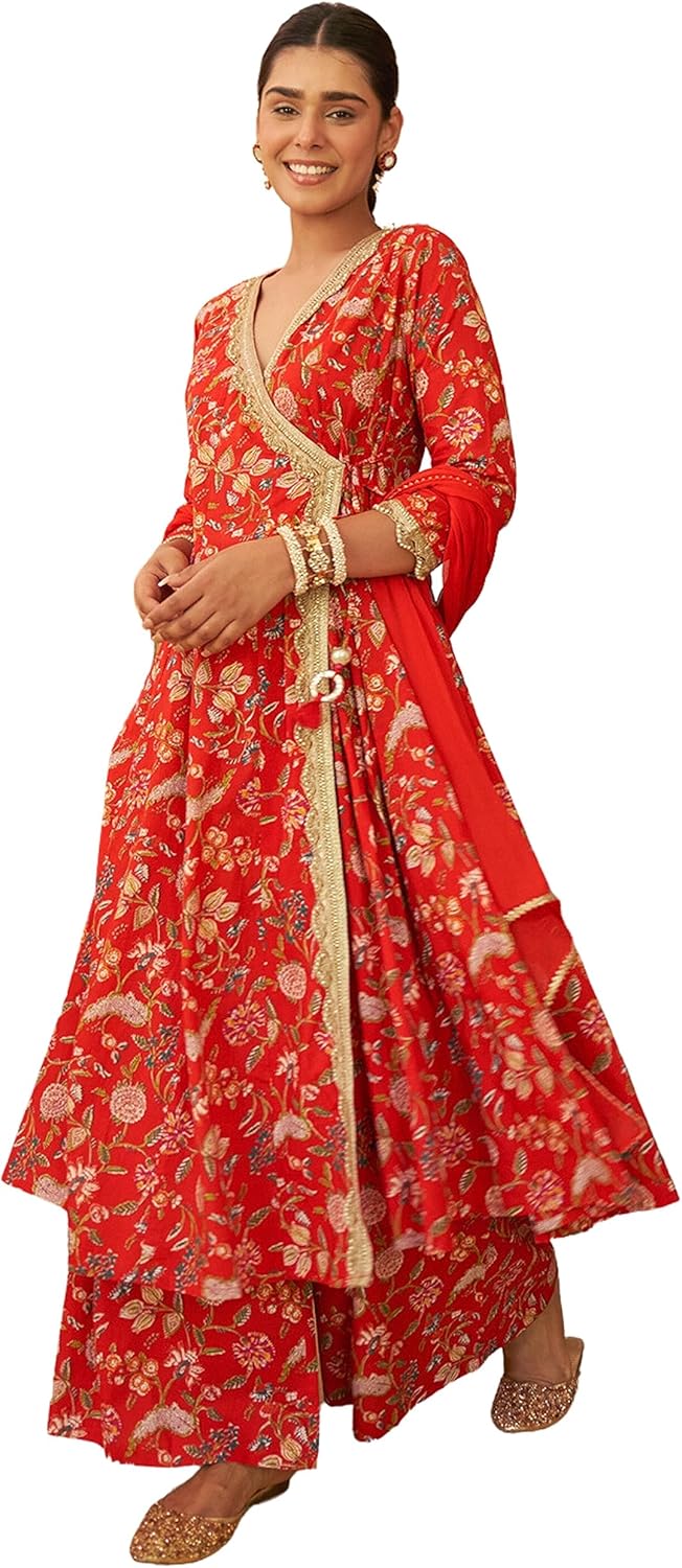 Introducing the Janasya Women’s Violet Cotton Floral Printed Kurta with Palazzo and Dupatta. The kurta is crafted from high-quality cotton fabric in a lovely Violet color. It features a vibrant floral print that adds a touch of elegance and charm. Designed in an Anarkali style, the kurta offers a flattering and flowy silhouette that enhances your feminine appeal. The kurta has 3/4th sleeves with regular length, the round neck with a calf-length of 48 inches, the kurta offers a graceful look suitable for festive occasions. Kurta features intricate lace work on the yoke and hemline, adding a touch of sophistication and elegance. The attention to detail enhances the overall aesthetic appeal of the outfit. The palazzo pants included in the set are made of Violet-colored cotton fabric. Completing the ensemble is the Violet-colored organza dupatta. With a length of 2.25 meters, it offers versatility in styling and draping options. The dupatta features a solid color, allowing it to complement the vibrant floral print of the kurta beautifully.