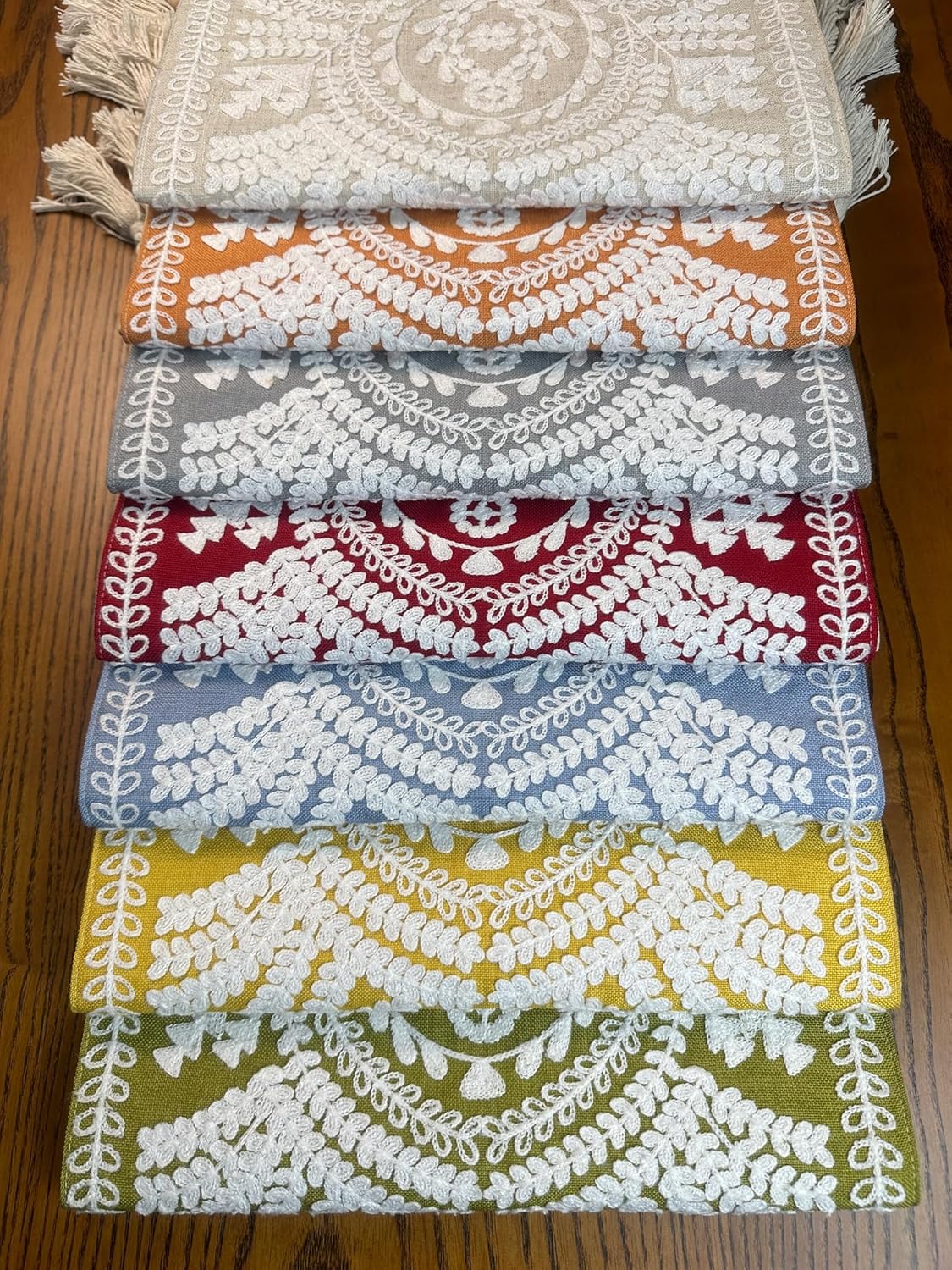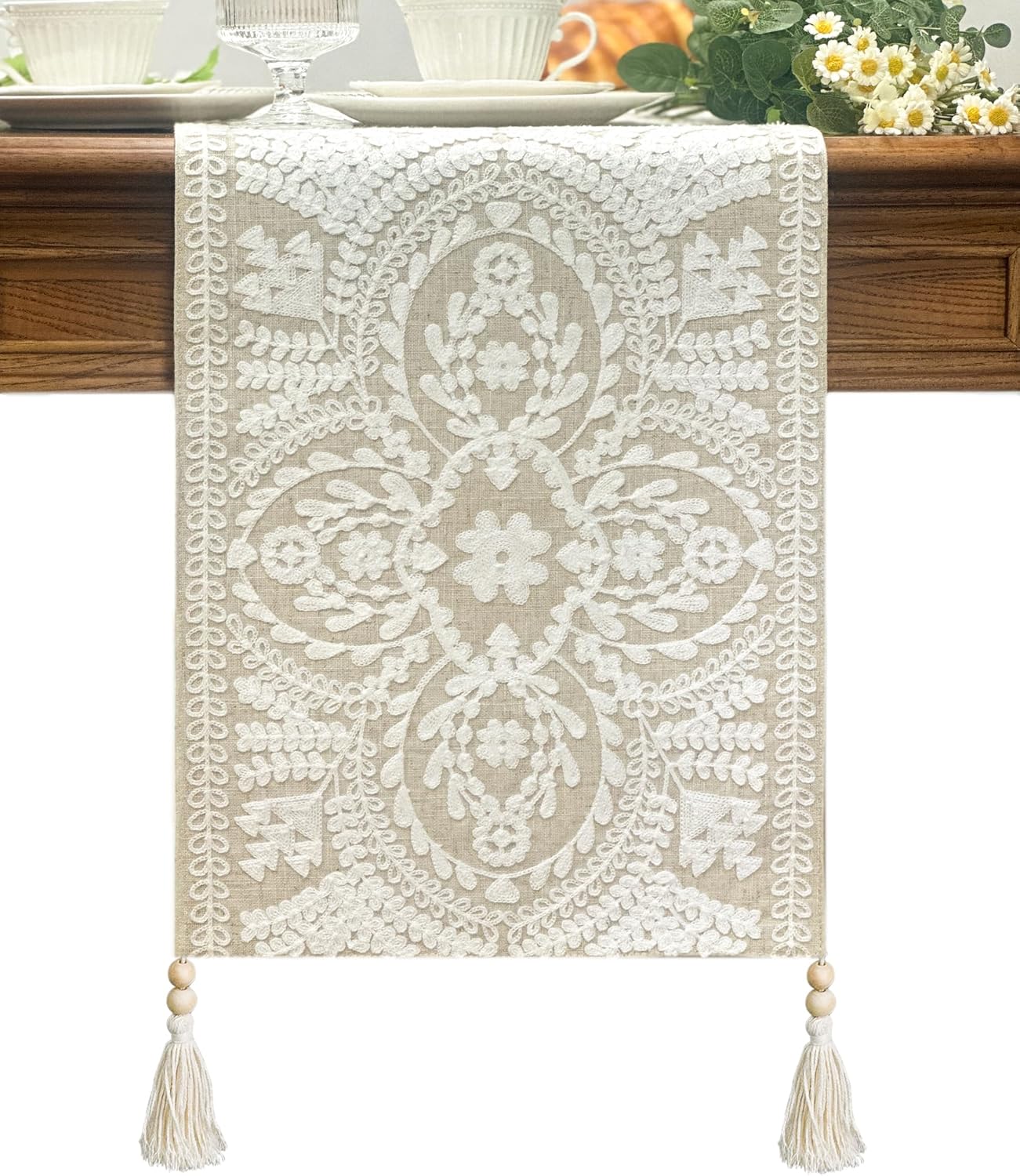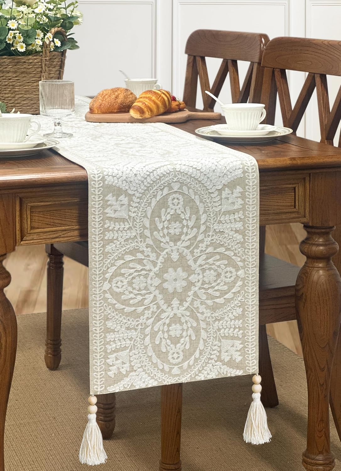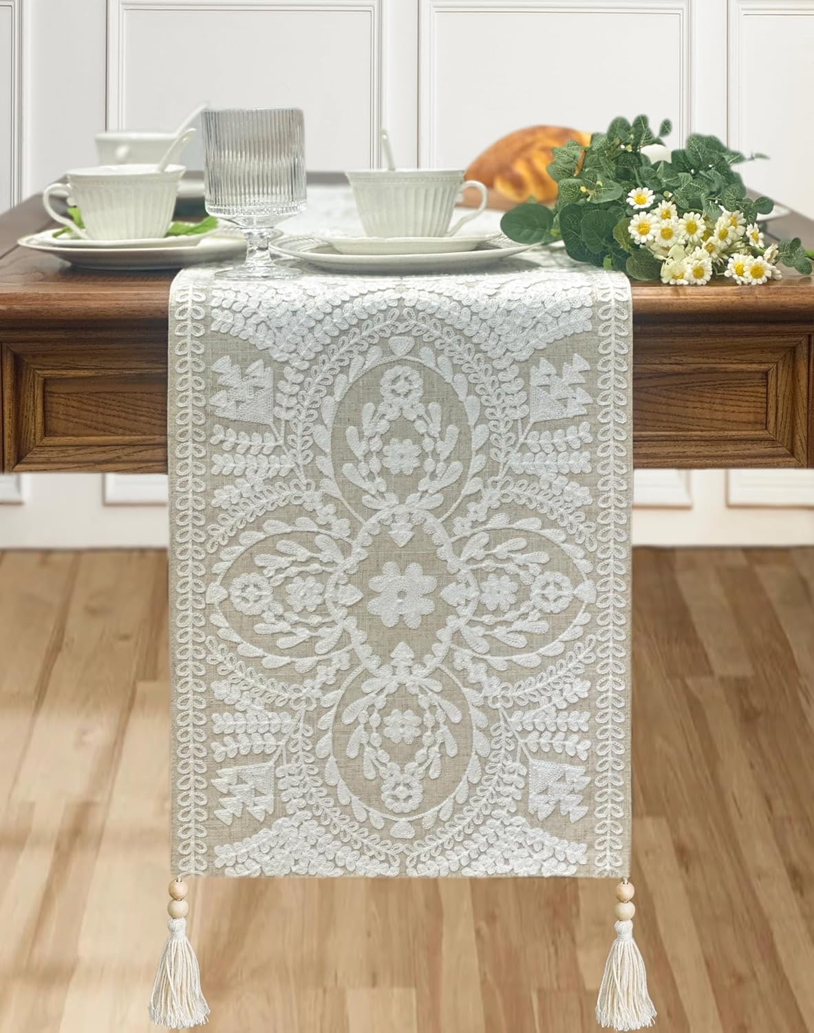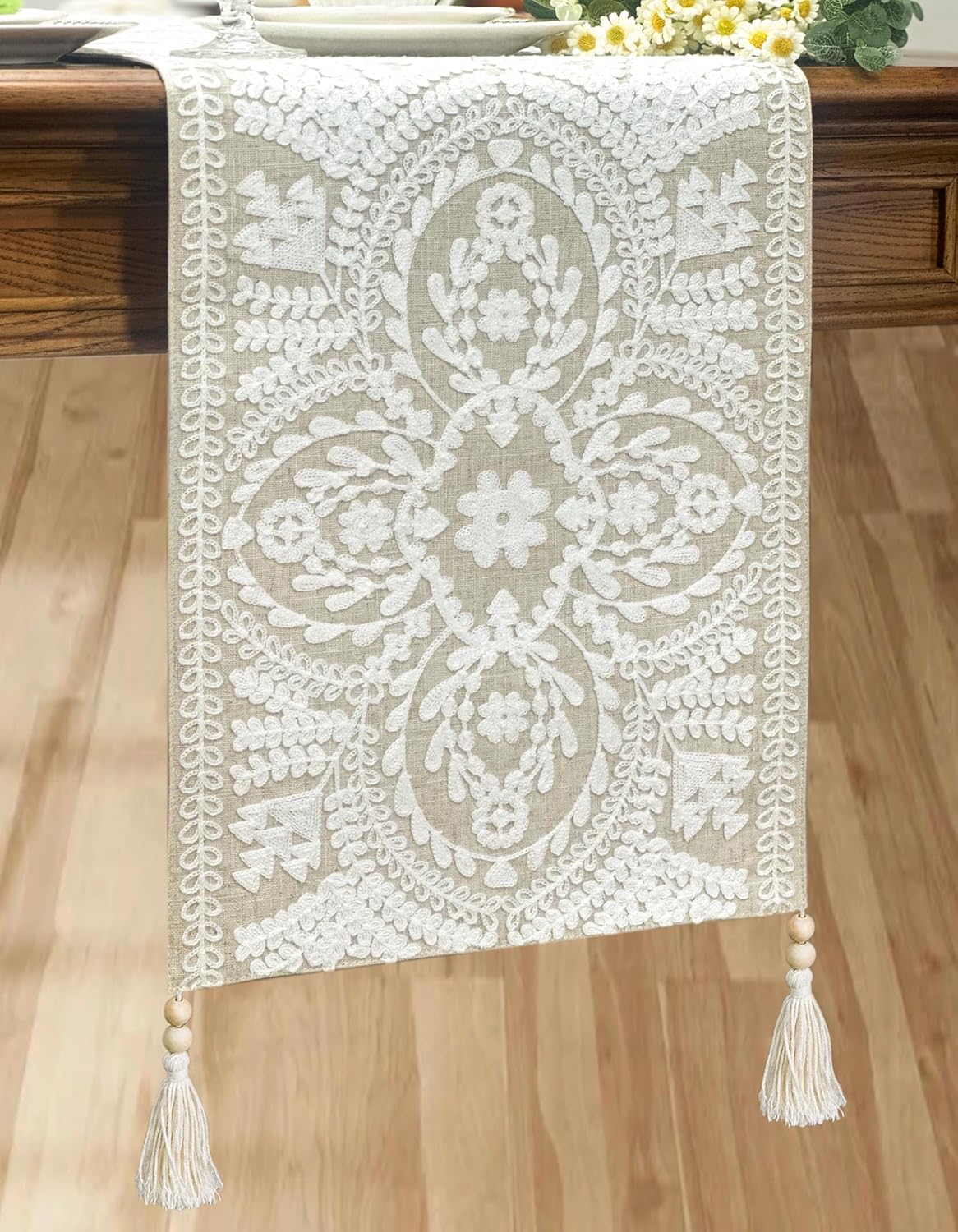 Unique Design: This brilliant table runner is exquisite boho pattern design with chain embroidery by white thread to make the pattern vividly and delicately. Using unique textured linen fabric exudes farmhouse charm, and neutral color gives it a natural, country look to bring a touch of rustic appeal to any kitchen or dining room table. Also add one hand-made wooden tassels on each corner of table runner to give it a warm, earthy and elegant look.
