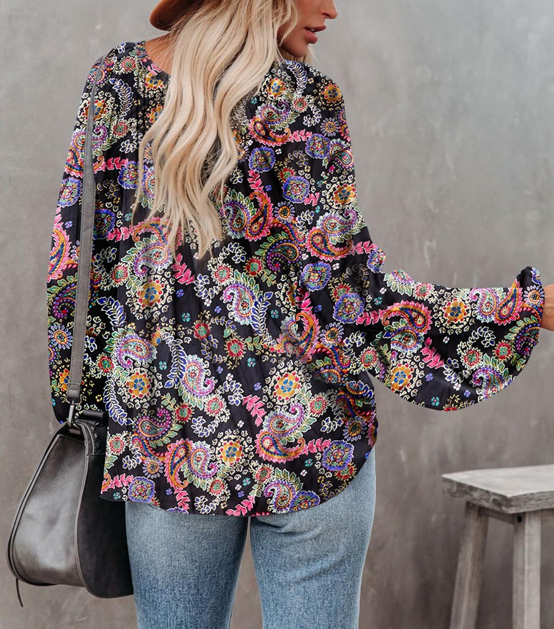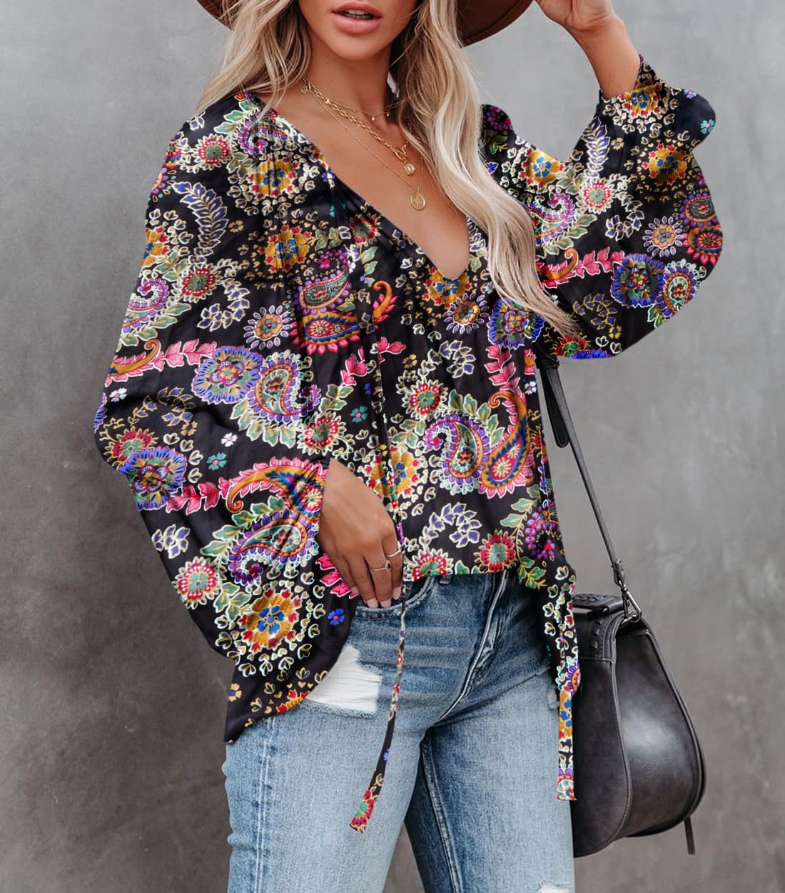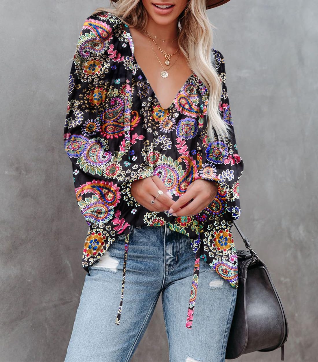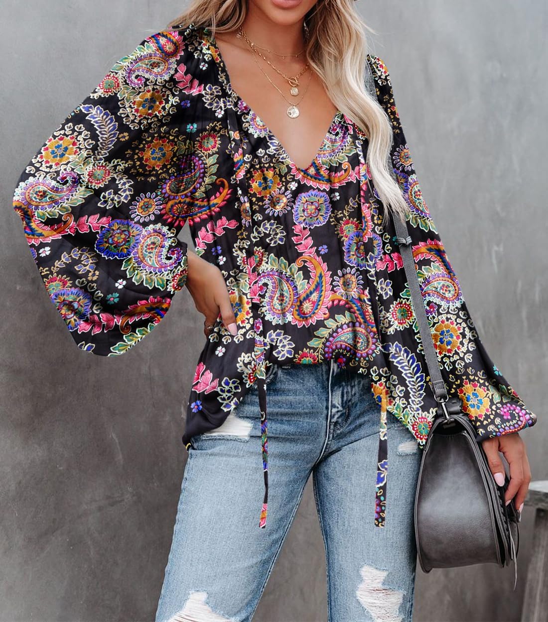 Womens sexy deep v neck blouse with drawstring, lantern long sleeve pleated silk satin shirt, casual loose solid chiffon pullover, unique patterns in floral or leopard prints, simple design in a stylish cool silhouette, makes you look casual and chic.