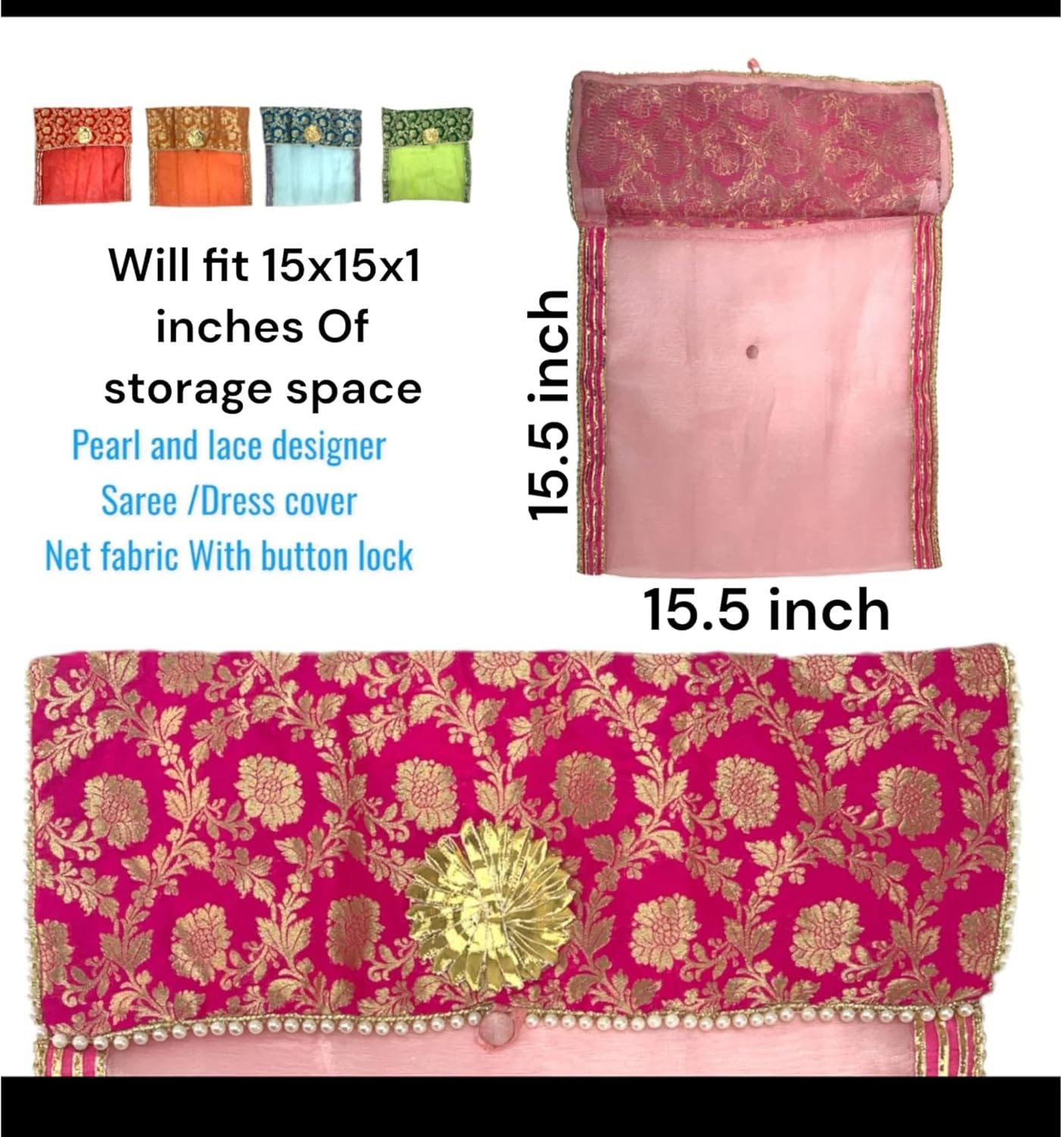 Organize with Style: These saree covers are designed to help you keep your sarees organized in your wardrobe. The button closure ensures that your sarees are securely stored and protected from dust and damage.