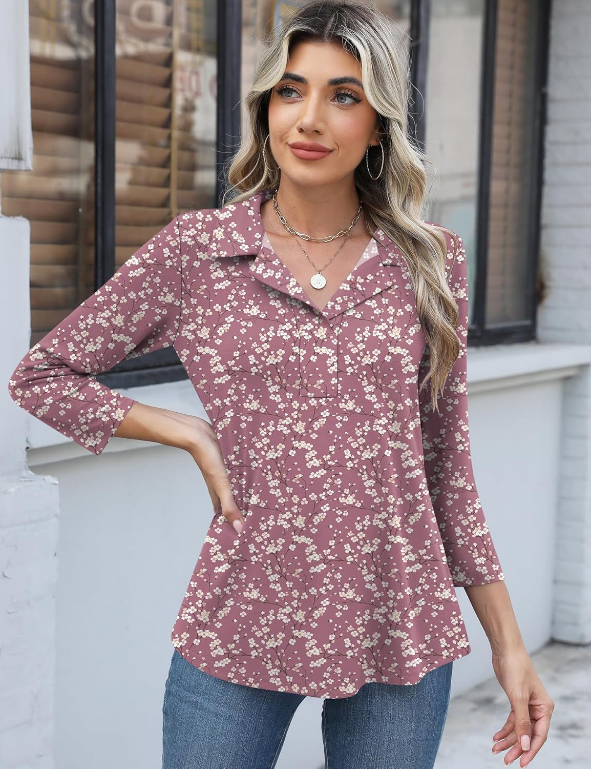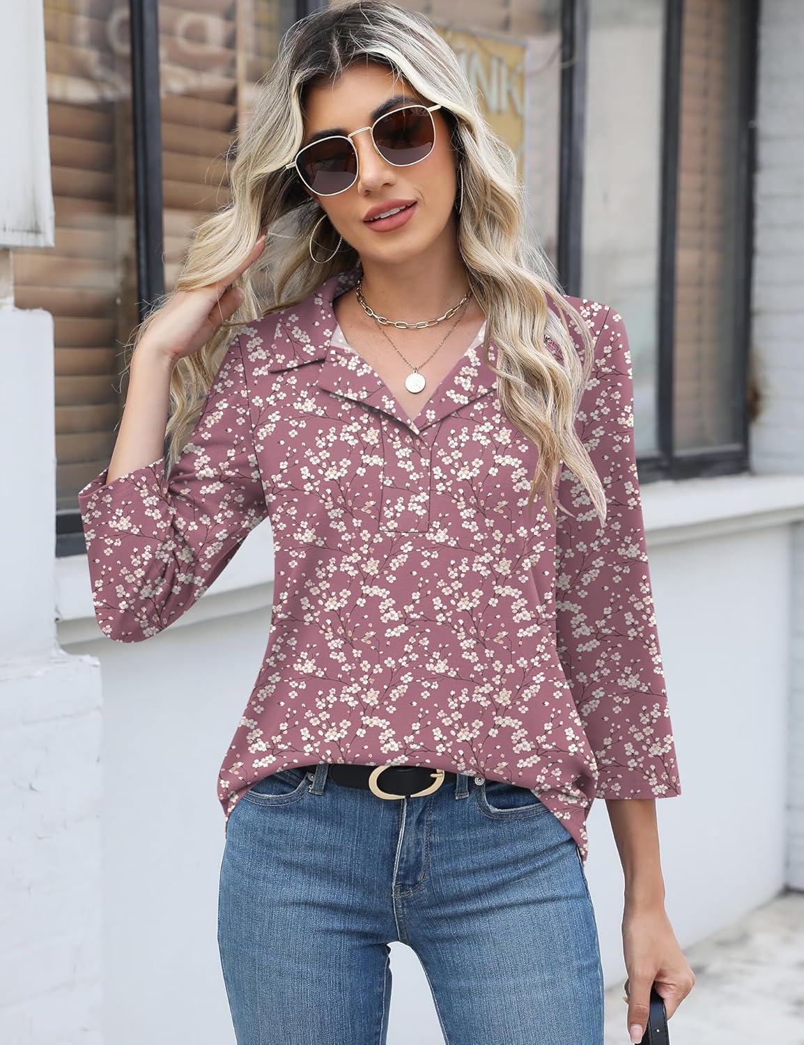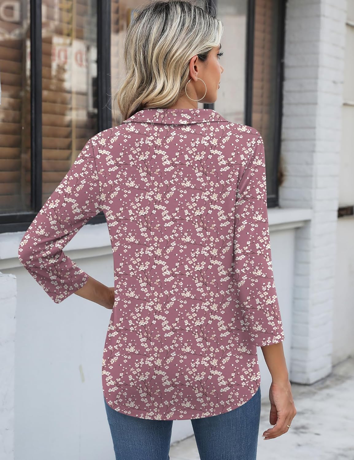 Women 3/4 Sleeve Casual Ladies Shirts Trendy Collared Polo Tops