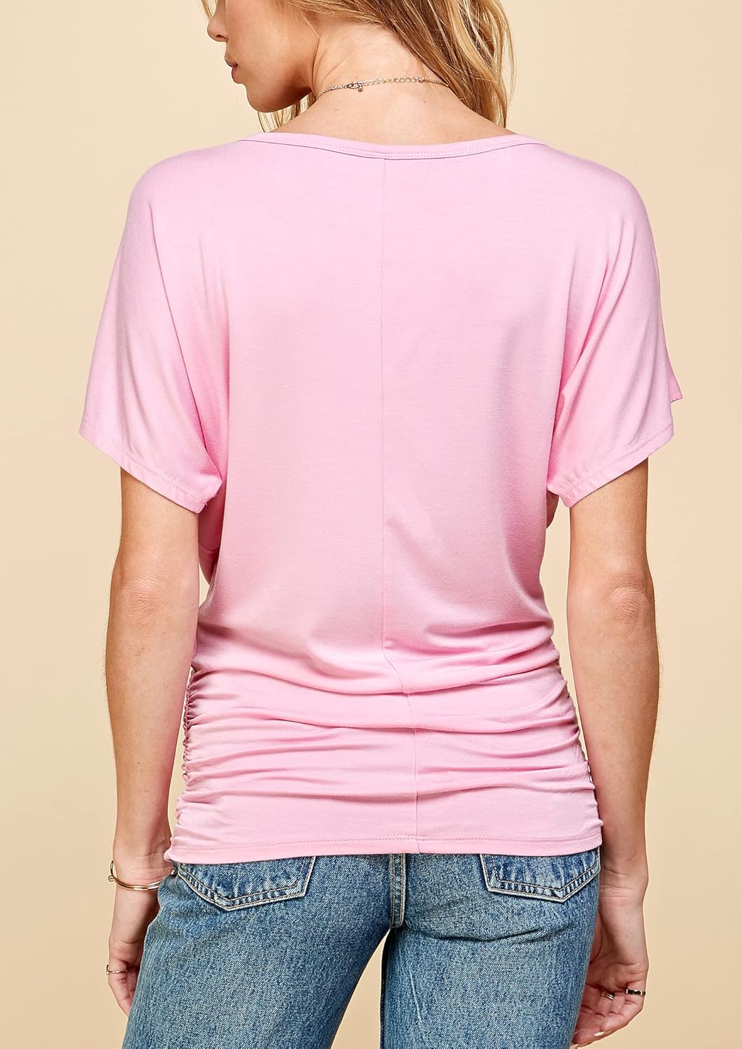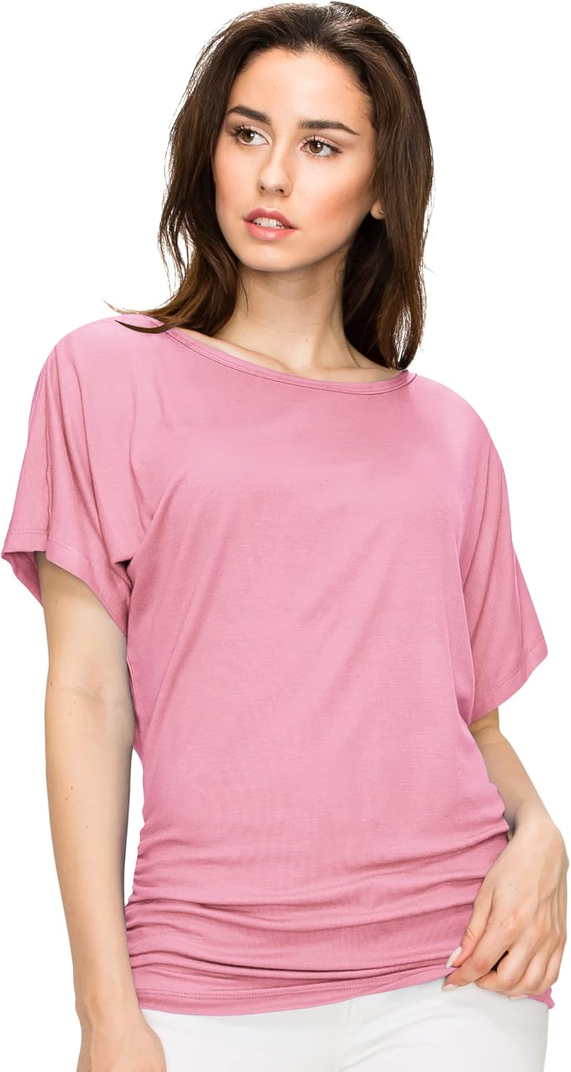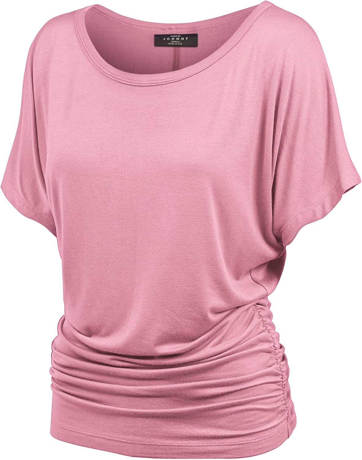 FABRIC : 95% RAYON 5% SPANDEXMade in U.S.A. or ImportedDo Not BleachLightweight fabric with great stretch for comfortRibbed on sleeves and neckline / Double stitching on bottom hemElastic shirring details at sides / Fit and flare fitHAND WASH IN COLD WATER / DO NOT BLEACH / LAY FLAT TO DRY / DRY CLEAN IF NEEDED