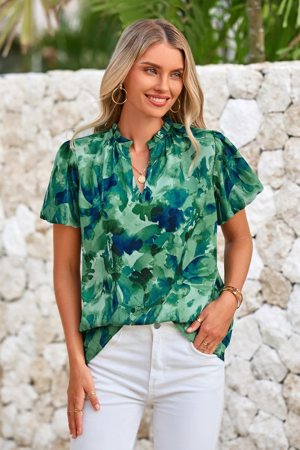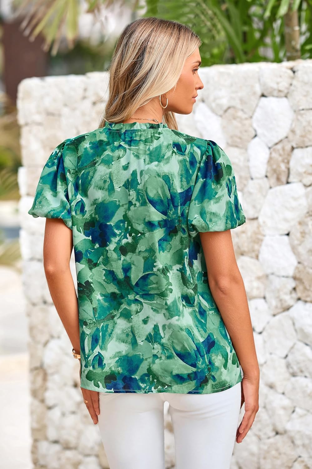 The V-neck and puff sleeves lend a feminine charm to this versatile dressy tops for women trendy, making it suitable for both casual and formal occasions.Whether you’re heading to work, meeting friends for lunch, or attending a special event, this summer blouses will leave a lasting impression.