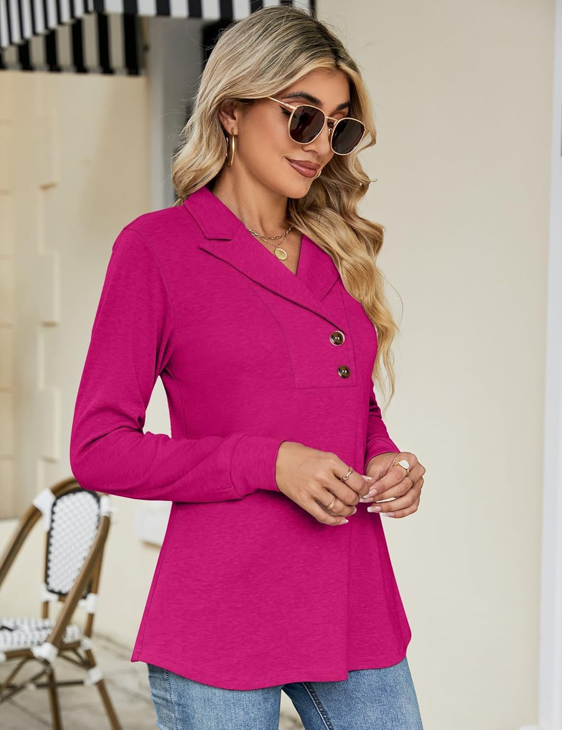 60% Polyester, 35% Rayon, 5% Spandex. The peak lapel pullover for women is made of super comfy and lightweight, breathable and stretchy fabric, which it’s very skin-friendly to use.