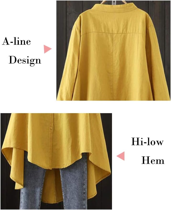 Minibee Women’s Cotton Linen Shirt High Low Button Down Embroidered Blouse Long Sleeve Tunic Tops