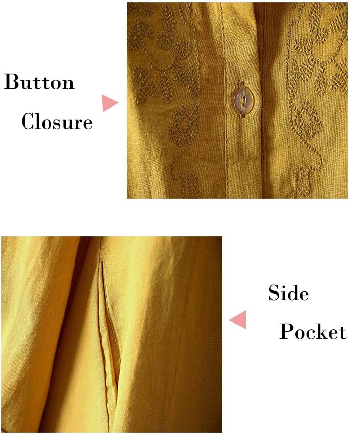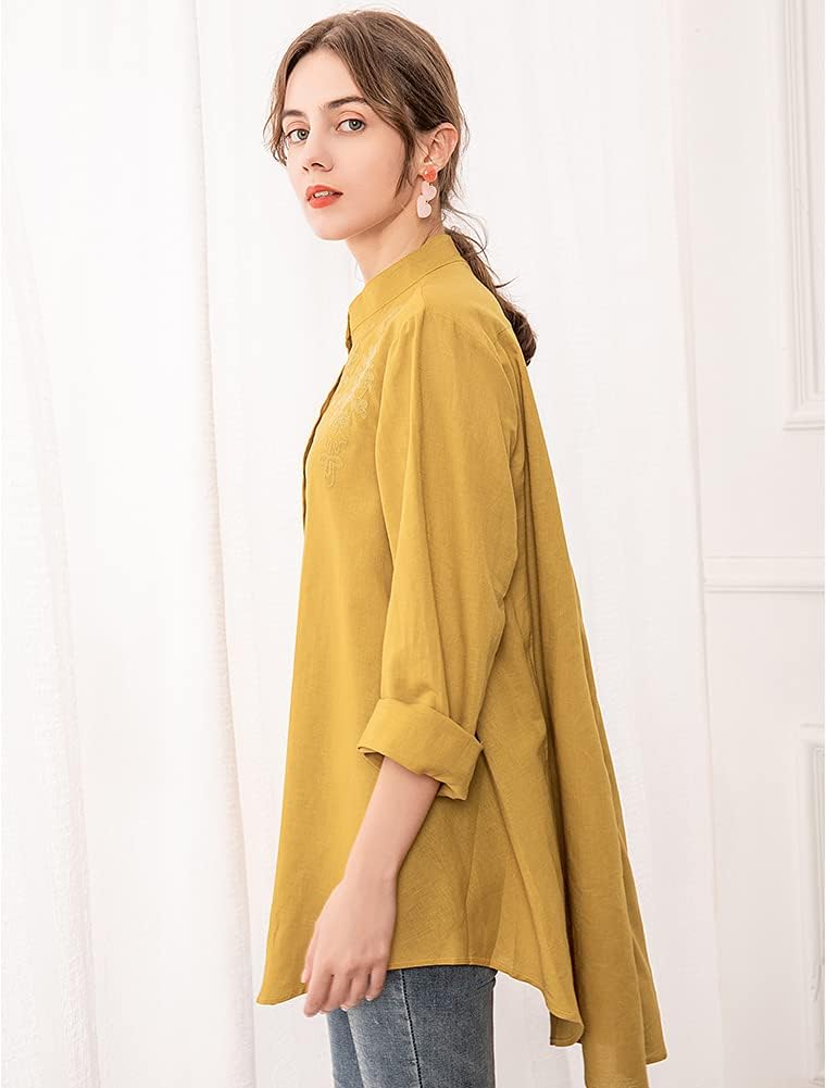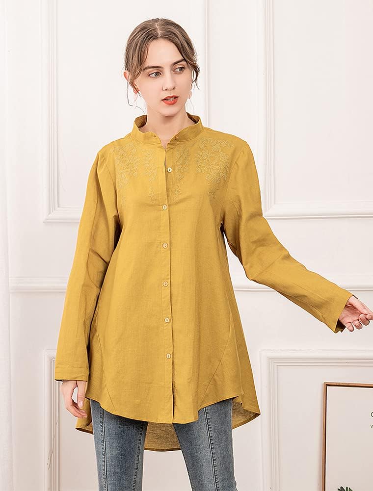Women’s Cotton Linen Shirt Embroidered Blouse Long Sleeve Tunic Tops