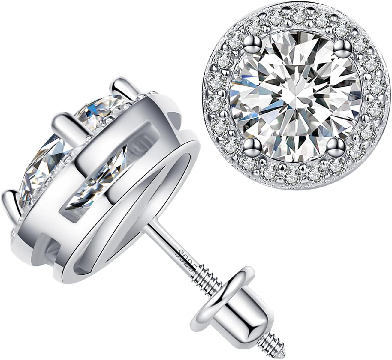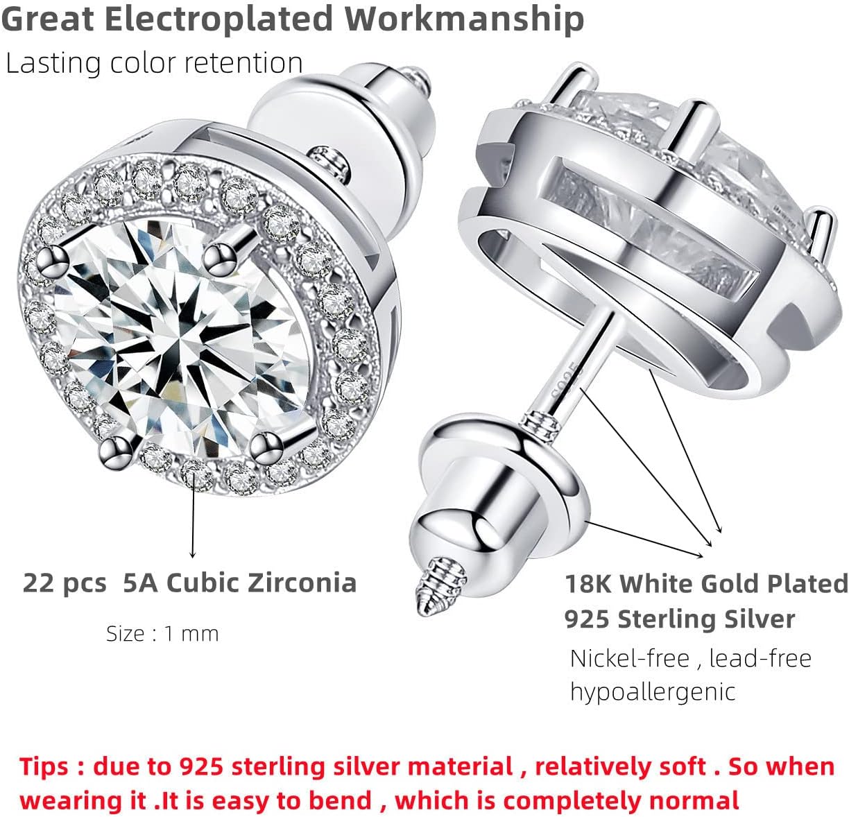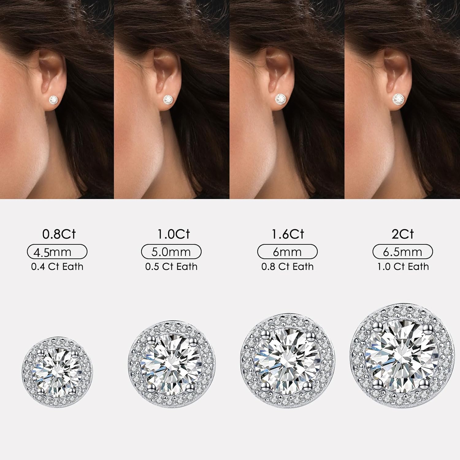 Material: 925 Sterling Silver Plated 18K White Gold Embed diamond weight :1 Pair 0.8Ct (0.4 Ct Each) .1 Pair 1.0 Ct (0.5 Ct Each) .1 Pair 2.0 Ct (1.0 Ct Each)