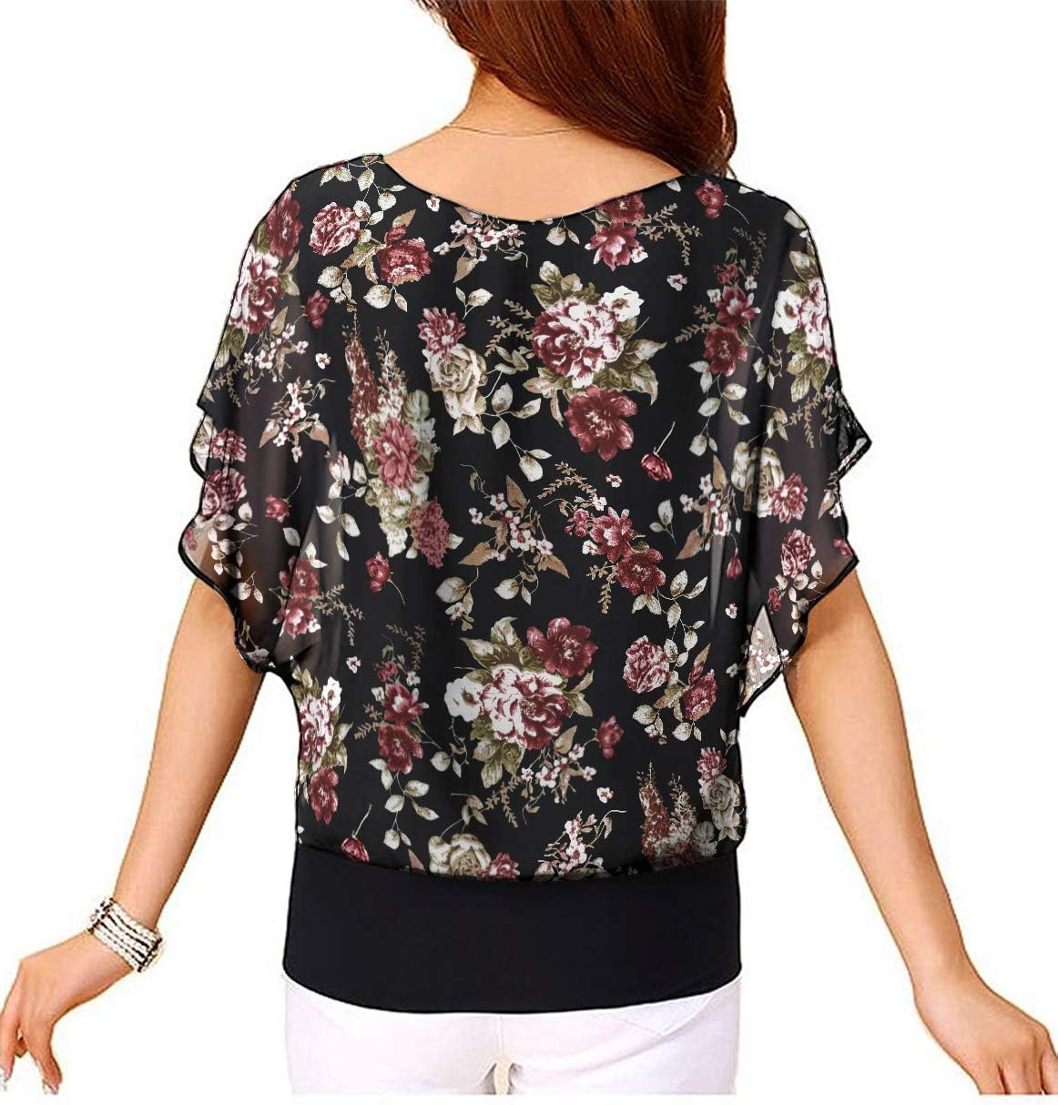 Neineiwu Women Casual Round Neck Batwing Chiffon T-shirts Elegant Tops Blouse