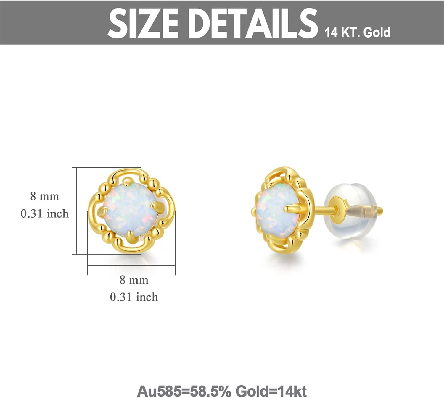 Our gold Opal Stud Earrings is made of 14K solid gold (58.5% pure gold, Not just a covering of gold-plated), nickel-free, hypoallergenic, and inlaid with high-quality opal.
