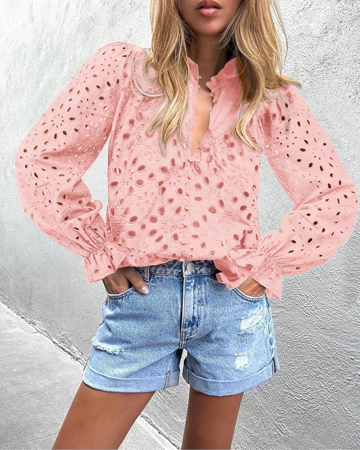 PRETTYGARDEN Long Sleeve Tops for Women V Neck Hollow Out Blouse Shirts