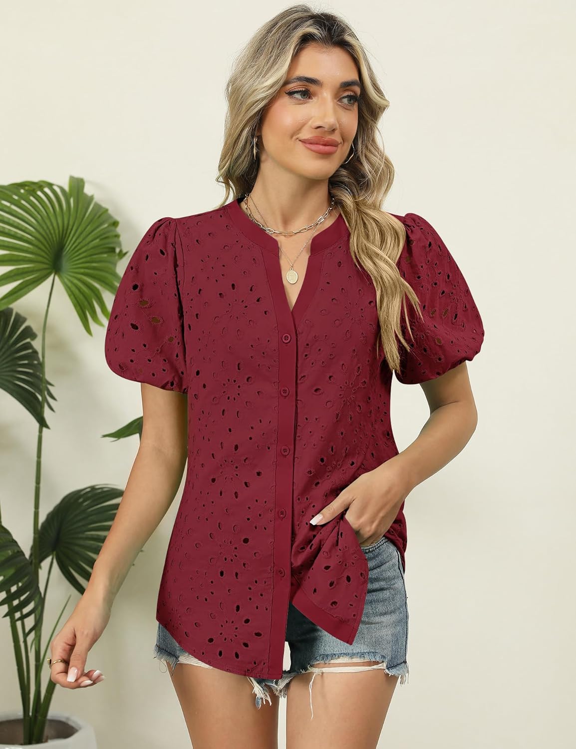 Rapbin Work Blouses for Women Button V Neck Hollow Out Embroidered Tops
